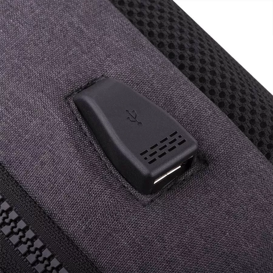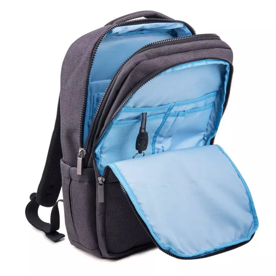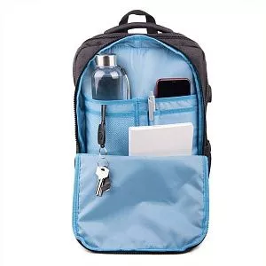 Стильный и функциональный рюкзак из коллекции COREПодходит для ноутбука до 15,6 дюймовОбъём около 17 лГолубой подклад из нейлона, nbsp;цвет близкий к PANTONE 292 CЦвет основного материала близкий к PANTONE 7540 CОсновное отделение с плотной эргономичной спинкой, дополнительным разделителем, с карманом с RFID защитой для размещения самых ценных предметов и встроенным USB nbsp;Внешнее отделение с мелкими кармашками для мелочей и держателем для ключей со съёмным колечком и светоотражающей детальюНебольшой внешний карман на лицевой стороне в нижней части на молнии со стильнымпластиково-металическим пуллеромБоковые карманы для бутылки или зонта с эластичной регулировкой шириныМягкие эргономичные лямки со светоотражающими элементами, креплением для очков и регулированием по длинеДеталь на спинке для крепления на ручку чемоданаОсновные отделения с двухзамковой тракторной молниейи матовыми металлическими пуллерами Back amp;FlyФирменная декоративная прострочкаПыльник для хранения в комплекте, nbsp;индивидуальная упаковка в прозрачную плёнку nbsp;