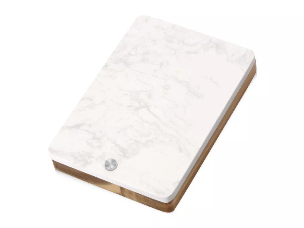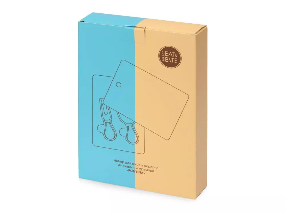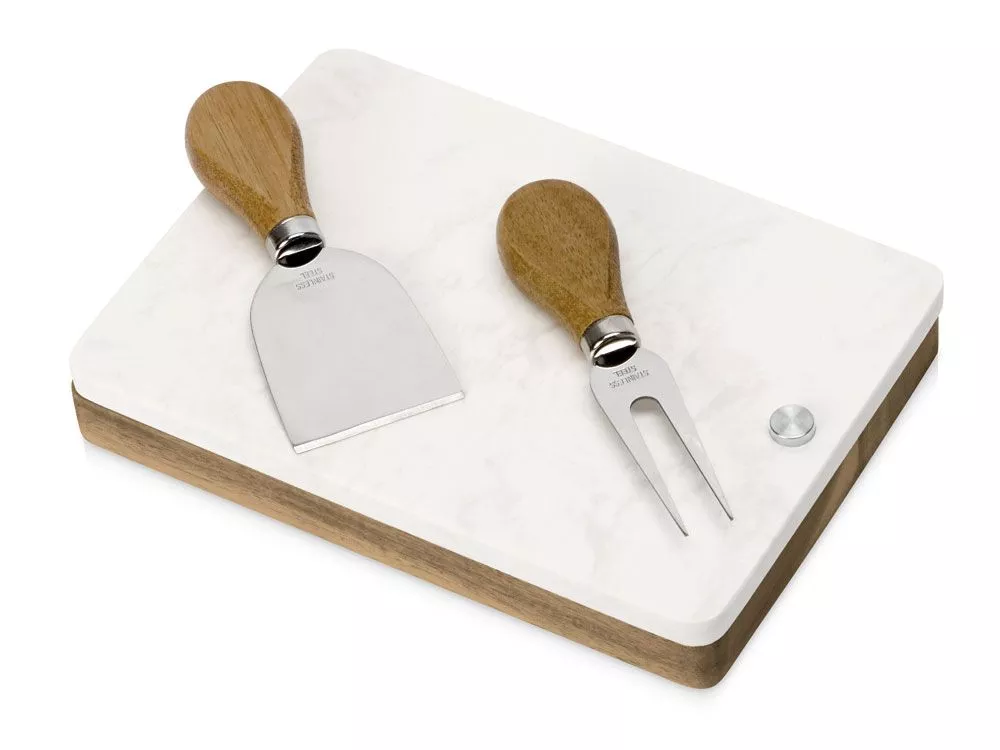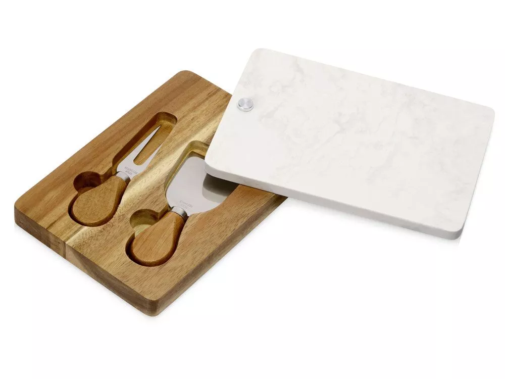 Набор для сыра бренда Eat&Bite Select состоит из ножа и вилки в футляре. Высококачественные материалы — акация и искусственный мрамор — обеспечивают набору долгую жизнь и благородный внешний вид. Крышка футляра, выполненная из белого мрамора, благодаря своей твердости может использоваться как разделочная доска, а благородный внешний вид делает ее идеальным вариантом для сервировки сыров и закусок. Ручки ножа и вилки — из акации, удобной формы, и для каждого из приборов в деревянном футляре предусмотрена вырубленная ниша, обеспечивающая бережное хранение приспособлений. Гравировка (оптоволоконный лазер) (Без чернения) на данный товар осуществляется бесплатно. Оплачивается только настройка оборудования в размере 950 рублей на весь тираж.