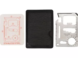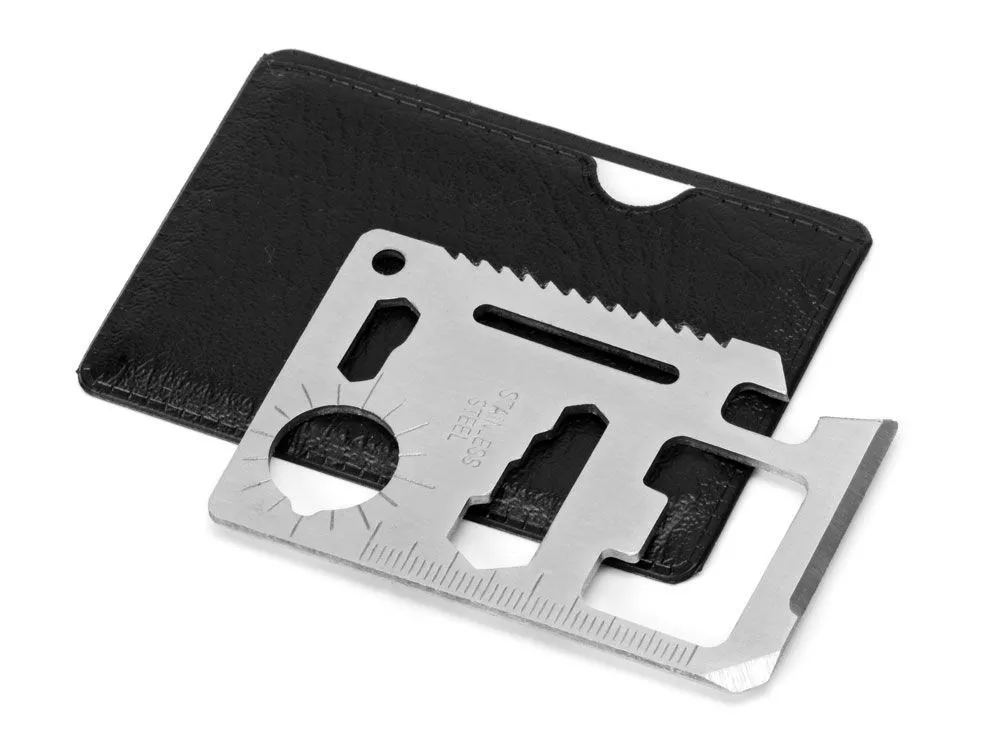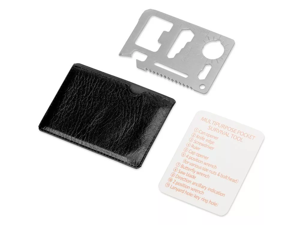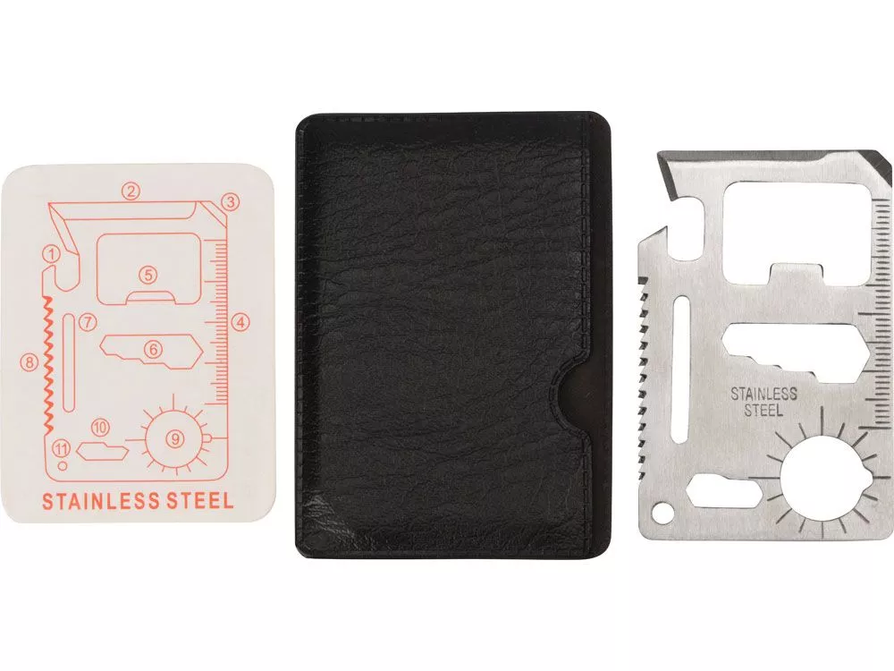Мультиинструмент Helper mini в виде карты объединяет в себе 10 различных приспособлений: консервный нож, лезвие, плоскую отвертку, линейку, открывалку для бутылок, гаечный ключ на 4 различных размера головок болтов, ключ для барашковых гаек, пила, транспортир, гаечный ключ на 2 размера. Мультиинструмент выполнен из нержавеющей стали, что обеспечивает легкость, прочность и долгий срок эксплуатации Helper mini. Карту можно подвесить на брелок или карабин (не идут в комплекте), продев их сквозь специальное отверстие. Для хранения прилагается специальный чехол из искусственной кожи (ПУ), который не даст острым краям мультиинструмента нанести ущерб вашей одежде или содержимому сумки, а также защитит Helper mini от загрязнений. Чехол плотно облегает мультиинструмент, имеет удобный крой и выемку для пальца, поэтому вытаскивать его удобно и легко. - нержавеющая сталь, стойкая к коррозии и механическим повреждениям - 10 функций - чехол удобного кроя из искусственной кожи защитит мультиинструмент от загрязнений, а карманы — от острых краев изделия - отверстие под брелок или карабин Приспособления, входящие в Helper mini: 1. консервный нож, 2. лезвие, 3. плоская отвертка, 4. линейка, 5. открывалка для бутылок, 6. гаечный ключ на 4 различных размера головок болтов, 7. ключ для барашковых гаек, 8. пила, 9. транспортир, 10. гаечный ключ на 2 размера, 11. отверстие под крепление к брелку или карабину Тиснение (Фольга) на данный товар осуществляется бесплатно. Оплачивается только настройка оборудования в размере 5800 рублей на весь тираж.