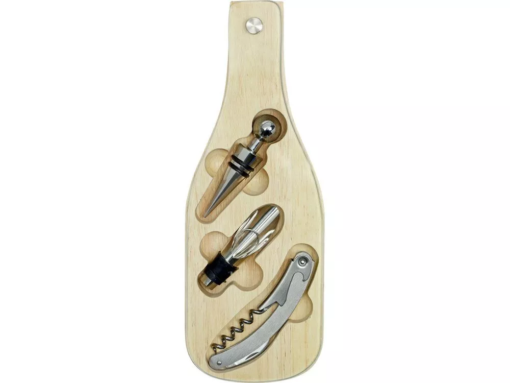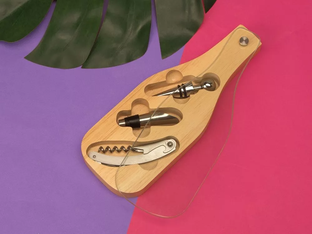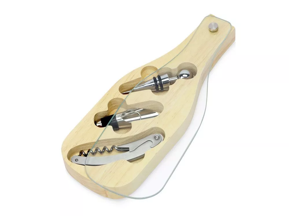 Набор аксессуаров для вина от Master of Wine выполнен в виде футляра из дерева со стеклянной крышкой с разместившимися внутри штопором, пробкой и аэратором. Футляр — в форме бутылки вина, что позволяет обыграть тему благородного напитка при помощи нанесения. Прозрачная стеклянная крышка может быть полностью запечатана по желанию клиента, который наверняка оценит столь большое поле для нанесения. Кроме того, крышка может быть использована для сервировки на ней сыров и закусок или для их нарезки. Деревянная часть футляра имеет три вырезанные ниши под каждое из приспособлений для вина, дополненные выемками под пальцы для удобного извлечения. Набор поставляется в разобранном виде для удобства нанесения. Гравировка (оптоволоконный лазер) (Без чернения) на данный товар осуществляется бесплатно. Оплачивается только настройка оборудования в размере 950 рублей на весь тираж.