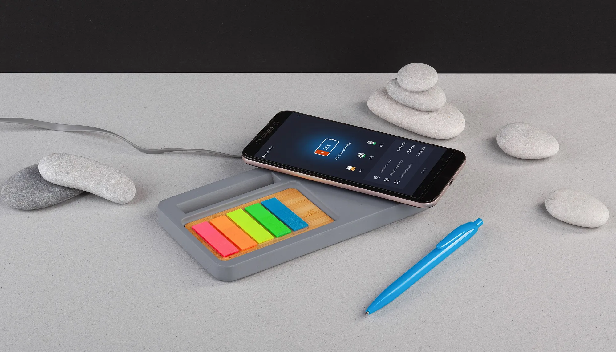 Органайзер выполнен из природных материалов – камня, бамбука и пробки. Компактный, практичный, стильный, экологичный, с актуальной функцией беспроводного заряда гаджет станет полезным аксессуаром как для рабочего стола, так и для домашнего интерьера.