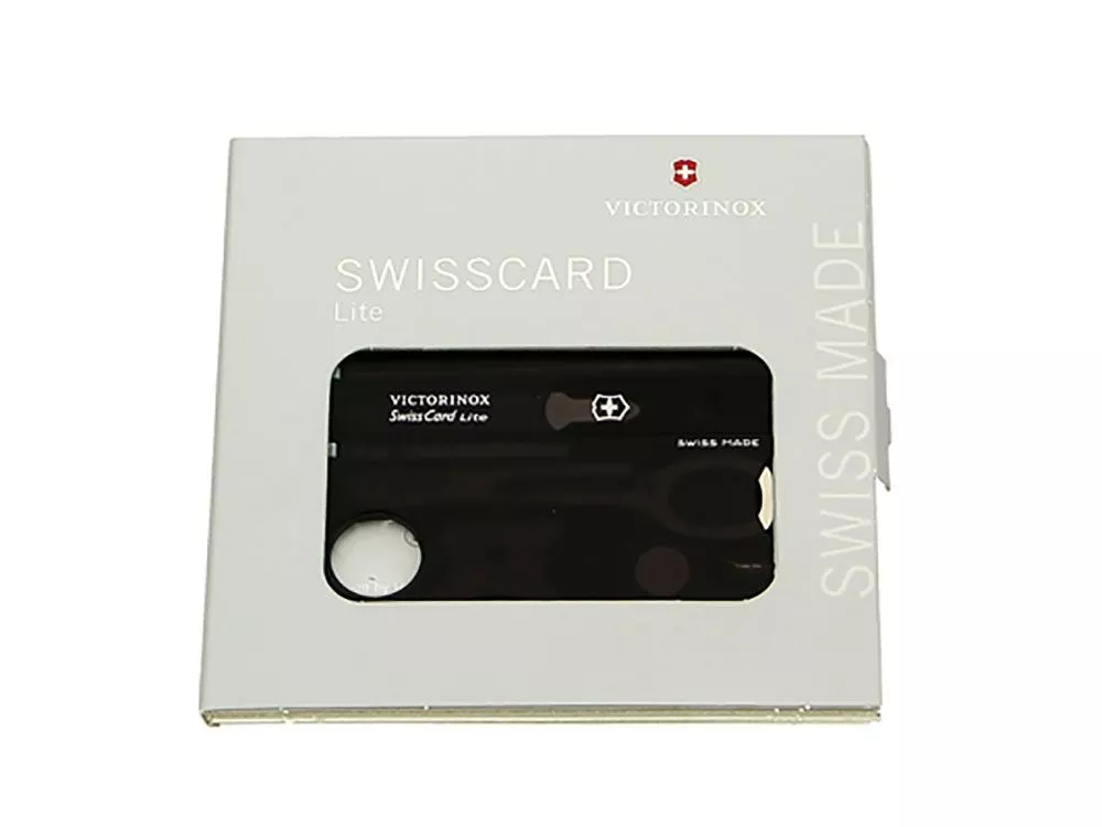 Швейцарская карточка SWISSCARD LITE – это многофункциональный набор из 13 предметов: 1. Нож для вскрытия конвертов 2. Ножницы 3. Пинцет 4. Шариковая ручка 5. Булавка из нержавеющей стали 6. Линейка (см) 7. Линейка (дюймы) 8. Лупа 9. Отвёртка 3 мм 10. Отвёртка 5 мм 11. Крестовая отвёртка 00-0 12. Крестовая отвёртка 1-2 13. Светодиод ХАРАКТЕРИСТИКИ: Цвет: полупрозрачный чёрный Длина: 82 мм Ширина: 54 мм олщина: 4,5 мм Размер в упаковке: 120 х 120 х 6 мм Вес нетто: 26 г Упаковка: плоская коробка с откидной крышкой