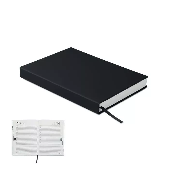 A5 daily diary notebook in 60% recycled post consumer polyester and 40% PU cover. 416 universal pages in 70gsm recycled paper (208 sheets). With matching colour polyester ribbon page marker.