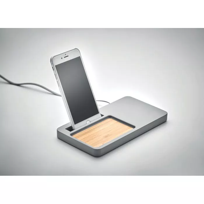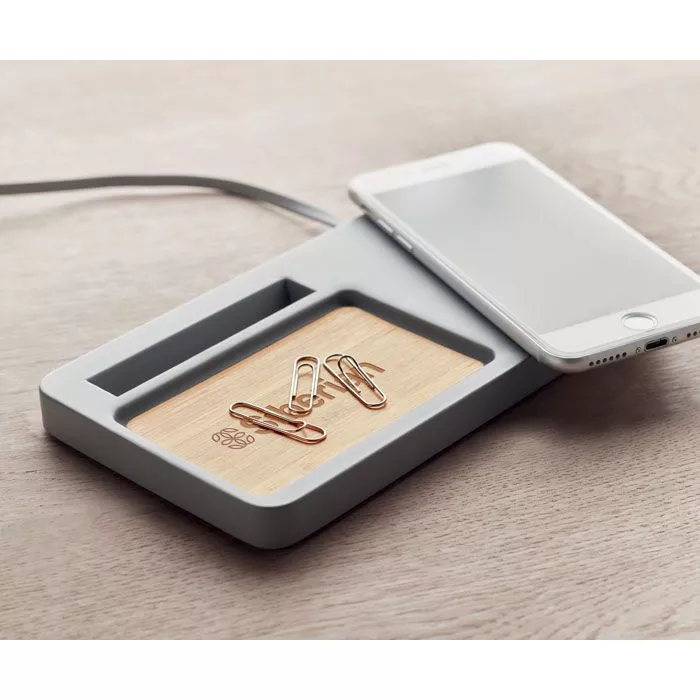 Настольный органайзер с беспроводным зарядным устройством из смеси цемента и бамбука. В комплекте USB-кабель длиной 100 см. Выход DC 5V / 1A. Совместим со всеми устройствами с поддержкой QI, такими как новейшие андроиды, iPhone® 8, X и новее. Бамбук является натуральным продуктом, могут быть небольшие различия в цвете