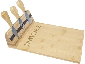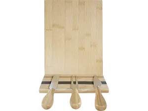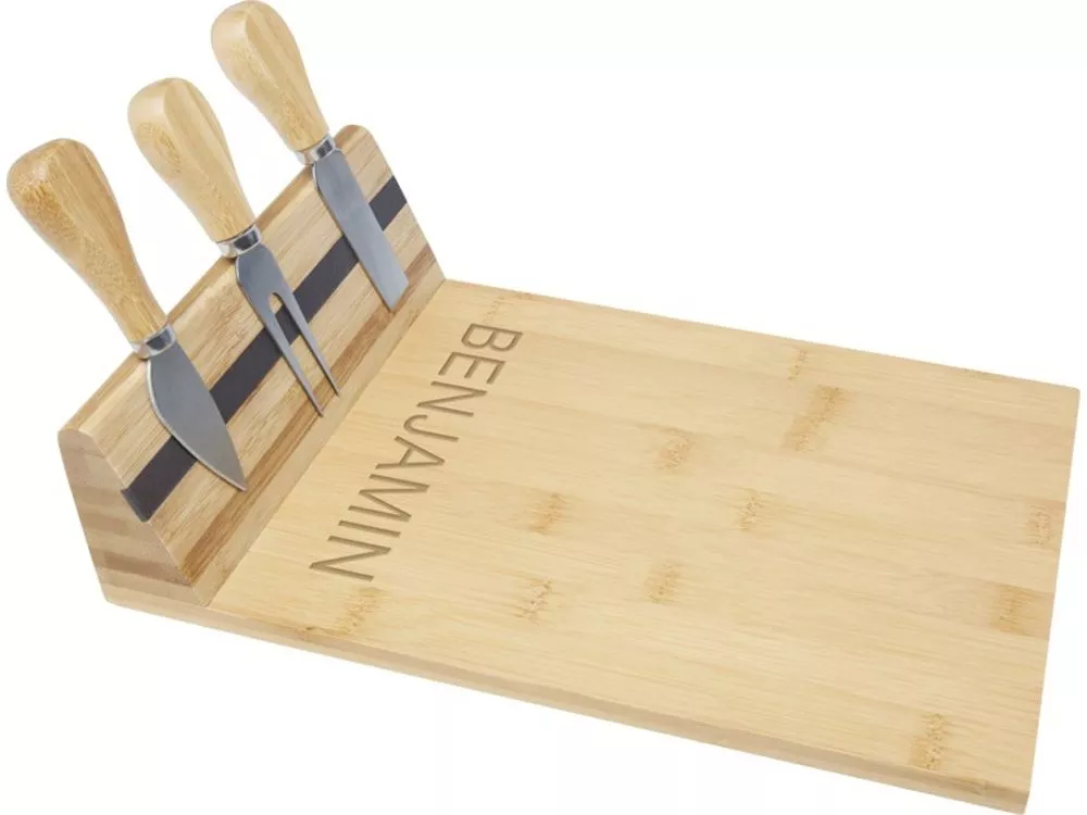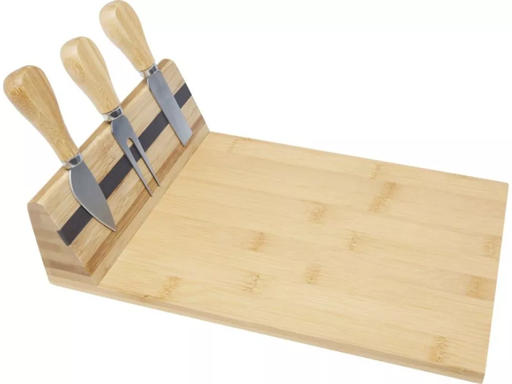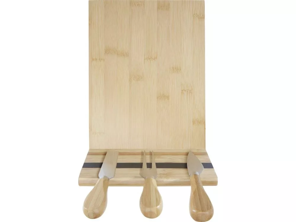 Набор для сыра из бамбука с доской для сыра. В комплект входит доска для сыра (30 x 20.2 x 7,6 см), 2 ножа для сыра (12,5 x 2,5 см и 12,5 x 2,7 см) и вилка для сыра (13,5 x 2,4 см). Боковая сторона доски для сыра оборудована магнитной лентой, к которой можно прикрепить инструменты для сыра, чтобы обеспечить стильную подачу. Используемый бамбук поставляется и производится в соответствии со стандартами устойчивого развития.