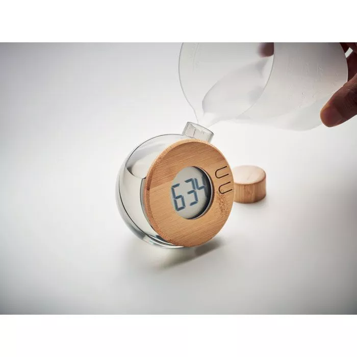 ЖК-часы с большим дисплеем и бамбуковыми деталями. Для питания этого продукта не нужна батарейка, только жидкость (соленая вода)!