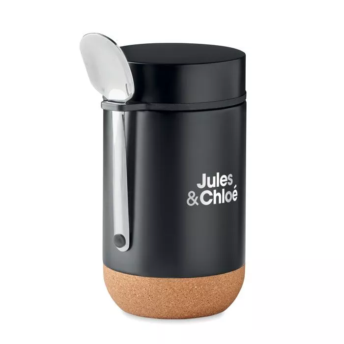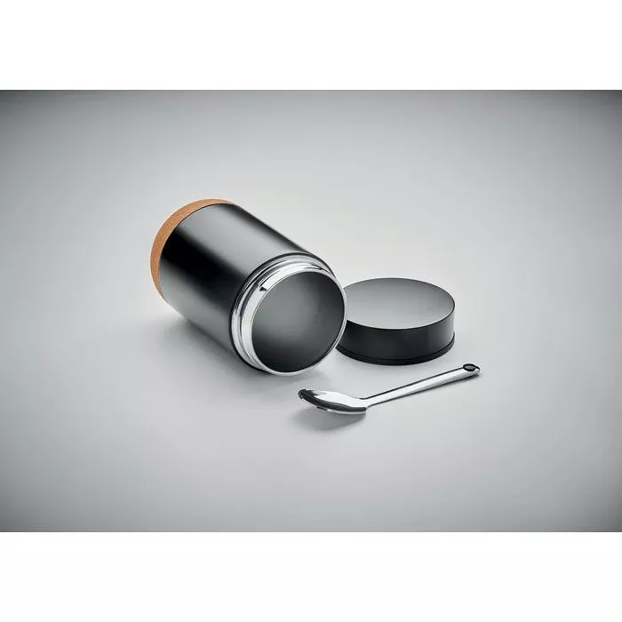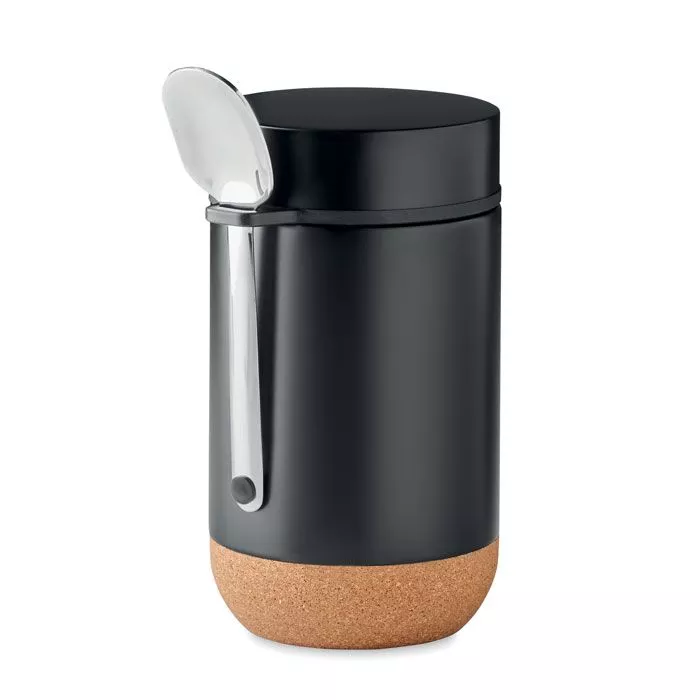 Изолированная банка для хранения с двойными стенками из нержавеющей стали с винтовой крышкой и пробковым дном. В комплект входит ложка. Вместимость: 400 мл.