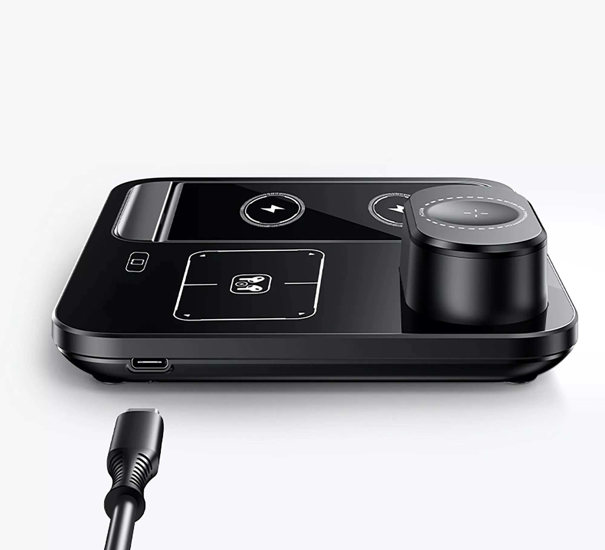 Автоматический подъёмный механизм панели для смартфона управляется сенсорной кнопкой, расположенной под зарядным блоком для наушников. Дополнительный бонус - зарядка смартфона возможна как в вертикальном, так и в горизонтальном положении (обе встроенные зарядные катушки выдают быструю зарядку до 15W).