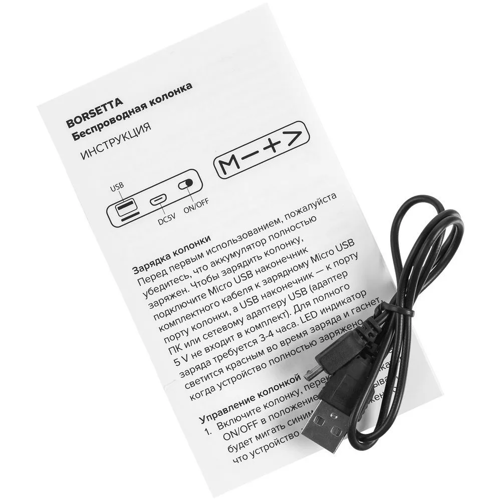 - В комплекте зарядный кабель Micro USB (выполняет функцию FM-антенны при подключении к гнезду колонки; к зарядному устройству при этом подключать не следует)