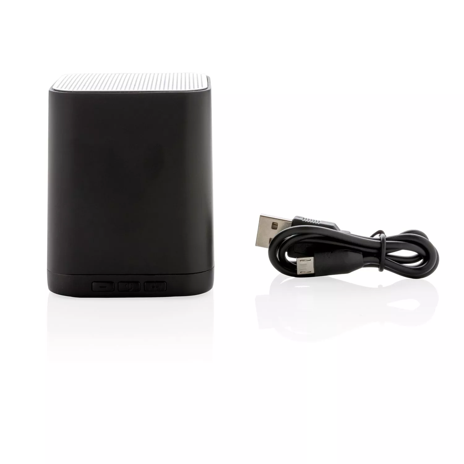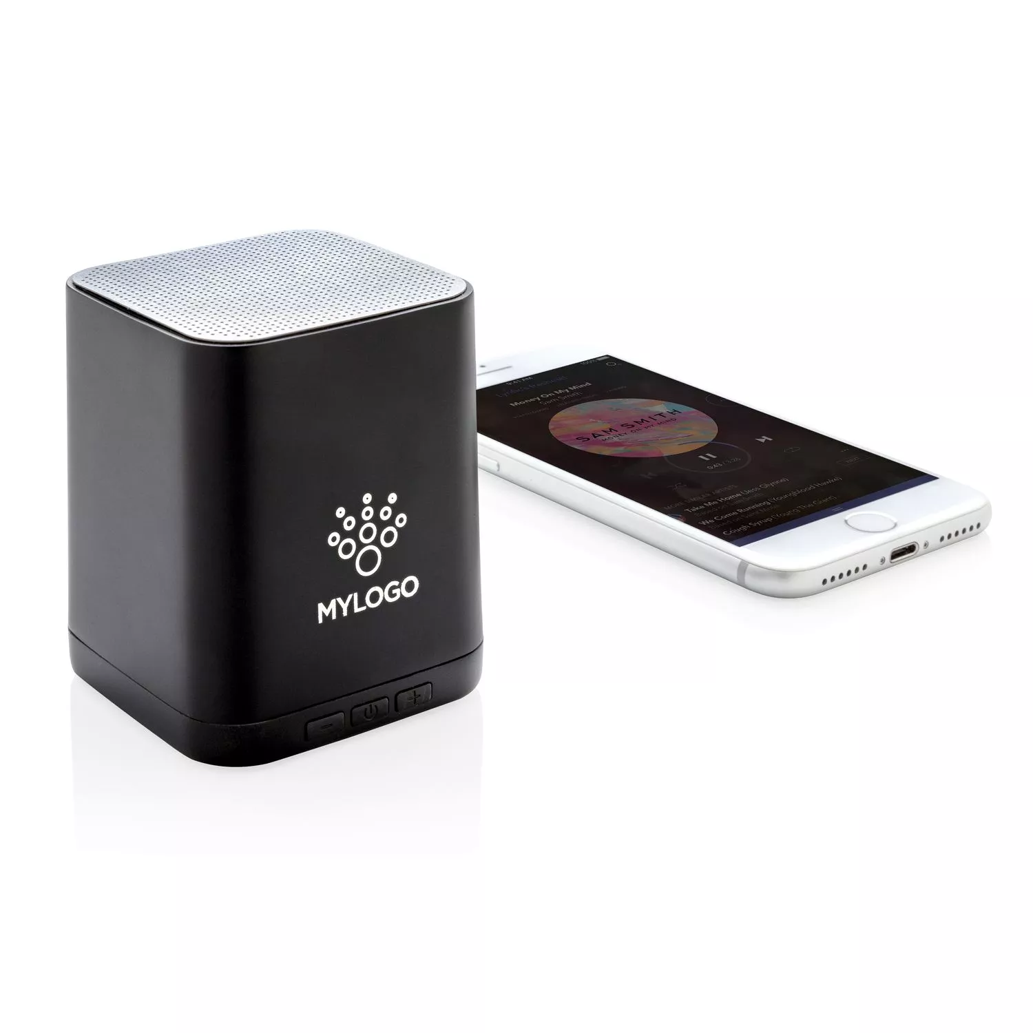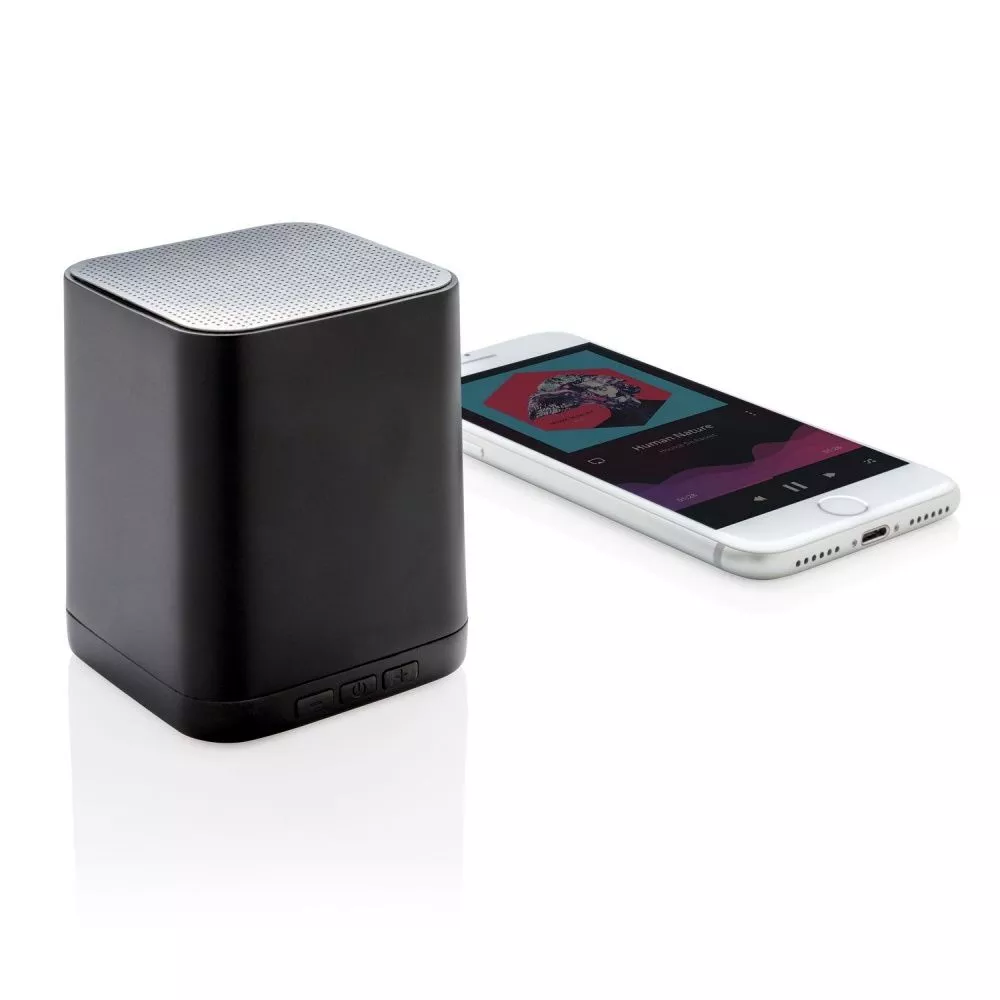 Беспроводная колонка 3W, которую можно кастомизировать, нанеся логотип на поверхность из ABS. Логотип будет загораться при использовании изделия, делая ваш бренд максимально заметным. Bluetooth версии 4.2 для стабильного подключения с рабочего расстояния 10 метров. Встроенный аккумулятор емкостью 400 мАч позволяет слушать музыку до 4 часов на одном заряде, а перезарядка занимает 1 час.