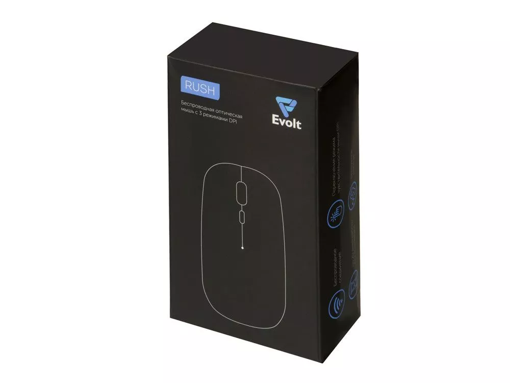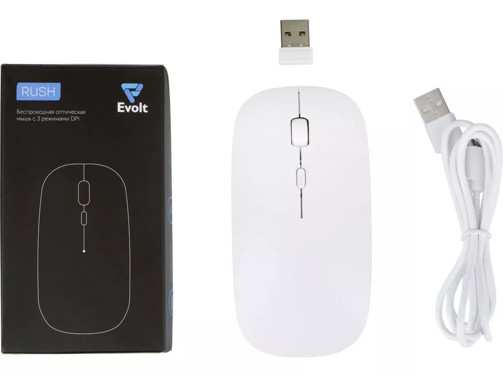 Беспроводная мышь от Evolt — легкая, удобная и бесшумная. Чтобы начать работу, извлеките адаптер USB из мыши и вставьте его в ПК или ноутбук. Работает без подзарядки до 20 дней — а когда заряд закончится, просто подключить зарядный кабель к USB-С. Можно продолжать использовать во время зарядки. • кнопка быстрого переключения чувствительности DPI • бесшумное нажатие со сроком службы до 5 000 000 кликов • дальность передачи сигнала до 10 метров Тампопечать (1 цвет (белые изделия)) на данный товар осуществляется бесплатно. Оплачивается только настройка оборудования в размере 4000 рублей на весь тираж.