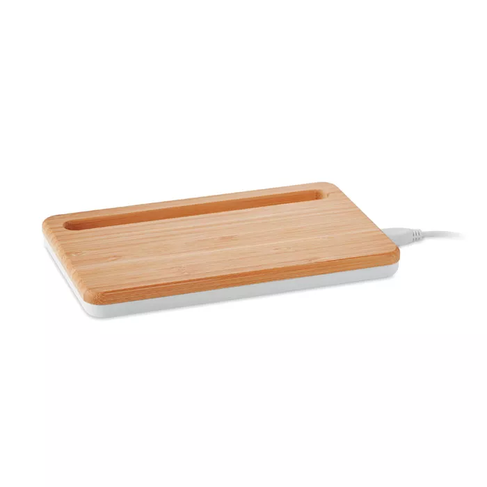 Wireless charger with bamboo top, USB hub and smartphone stand/holder. USB output DC5V/1A. Wireless output: DC5V/1A. Compatible latest androids, iPhone® 8, X and newer. Including type-C cable. As bamboo is a natural material, the colour per item can vary.