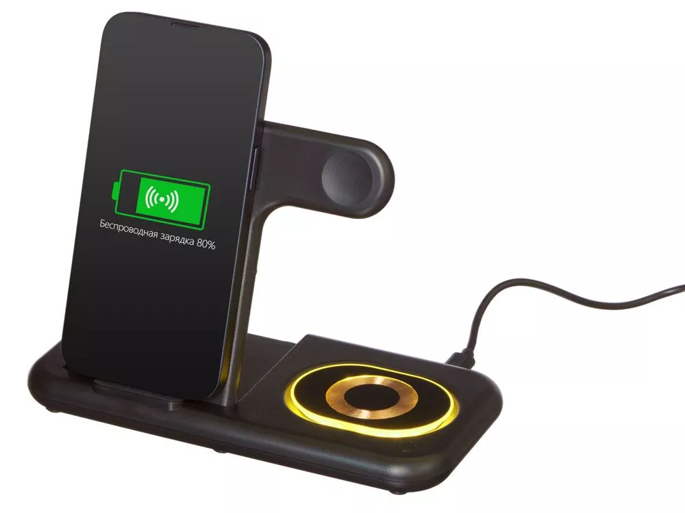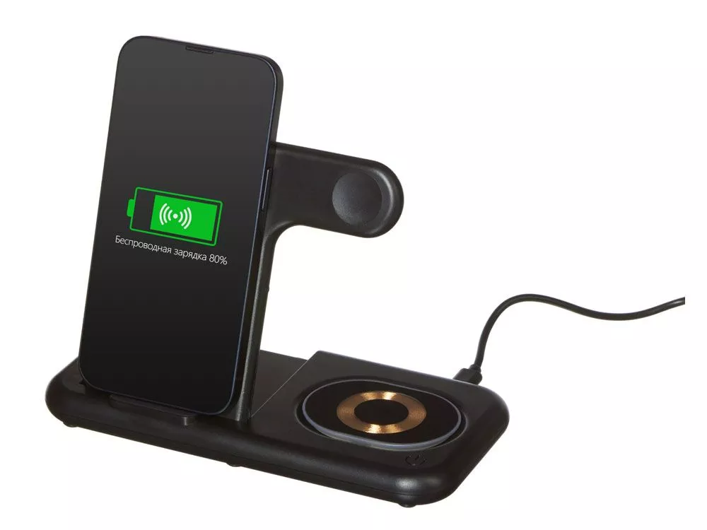 Беспроводная зарядная станция на 3 устройства MajestiQ с прогрессивным дизайном: модуль беспроводной зарядки в вертикальном сегменте станции может менять свое положение по принципу слайдера. Это позволяет настроить положение под размер любого смартфон, не снимая чехла. На станции можно заряжать три беспроводных устройства одновременно: смарт-часы Apple, смартфон и беспроводные наушники. Вместо наушников можно расположить для зарядки второй смартфон. MajestiQ поддерживает быструю беспроводную зарядку 15 Вт. * В зарядные модули встроена атмосферная подсветка с тремя уровнями яркости. Поставляется в сложенном виде, угол наклона можно выставить практически любой. • настраиваемая высота вертикального модуля зарядки • быстрая беспроводная зарядка до 15 Вт • 3 яркости подсветки зарядных мест • регулируемый угол наклона станции * при наличии сетевого адаптера 18 Вт и выше (в комплект не входит). Тампопечать (1 цвет (цветные изделия)) на данный товар осуществляется бесплатно. Оплачивается только настройка оборудования в размере 4000 рублей на весь тираж.