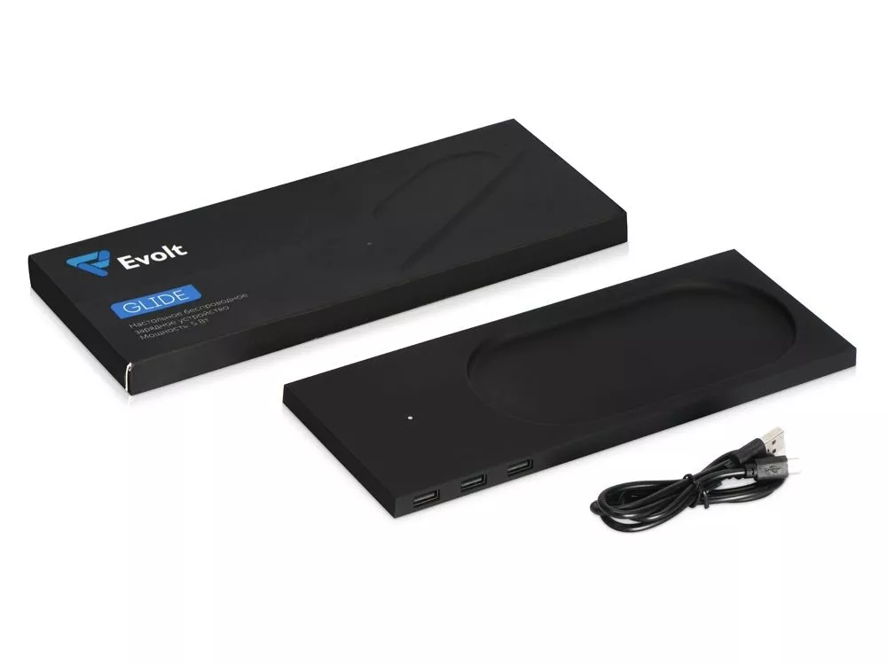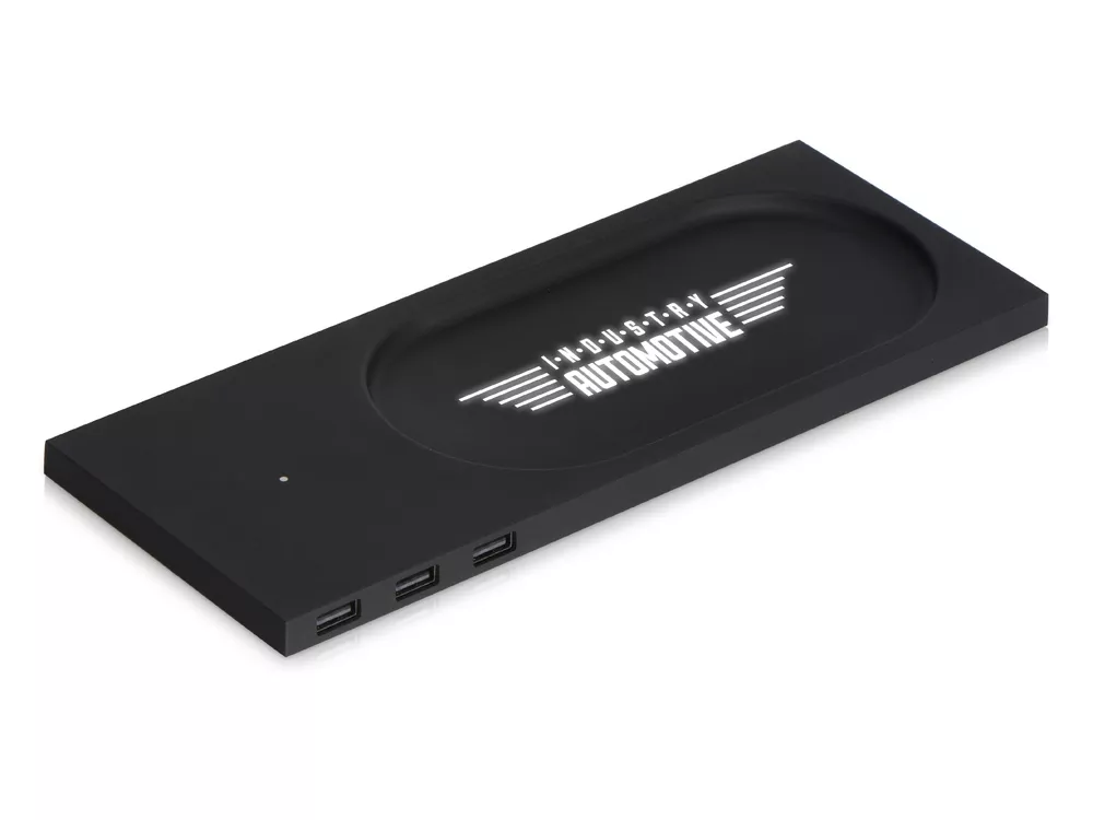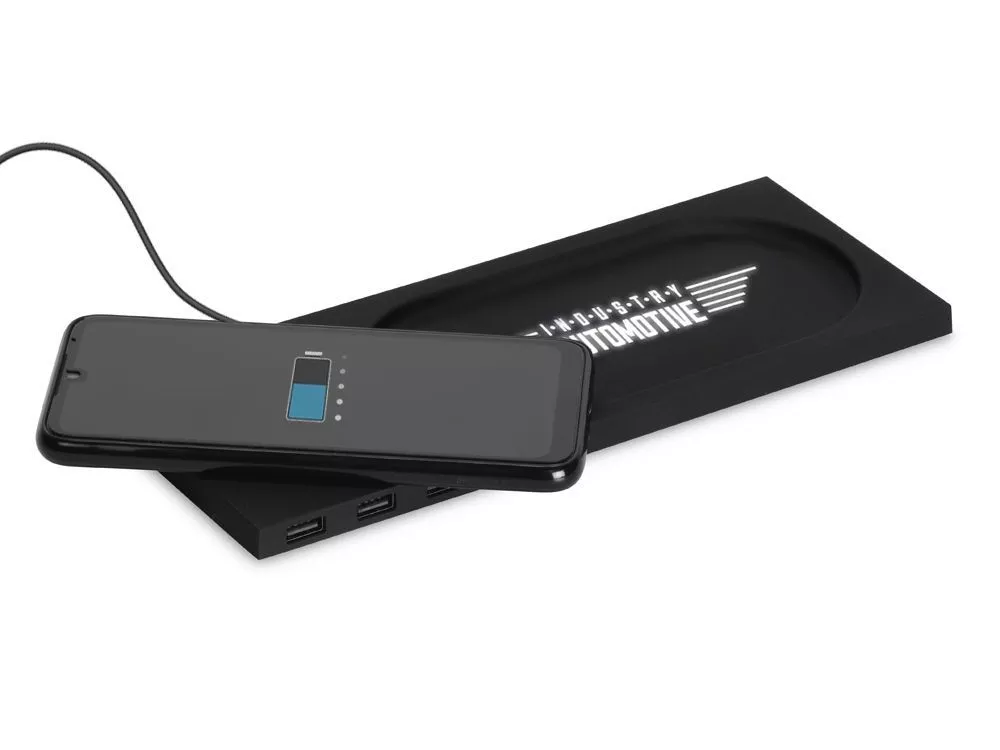 Беспроводное настольное зарядное устройство Glide выполнено из пластика с покрытием soft-touch. Кроме функции беспроводной зарядки имеет также 3 зарядных USB-разъема. Компактный органайзер имеет отсек для мелочи. После гравировки на устройстве вскрывается белый цвет подсветки, что позволяет сделать необычную и стильную персонализацию на этом гаджете.