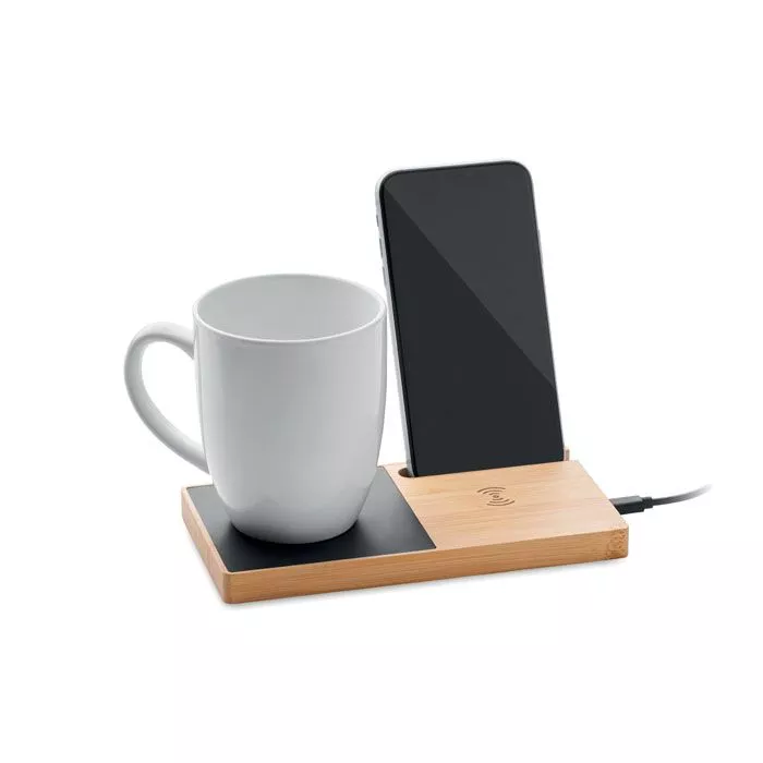 Беспроводное зарядное устройство из бамбука с подогревом кружки и подставкой для телефона. Подключите устройство к компьютеру, положите на него смартфон и дайте ему зарядиться. Выход: DC 9V/1.67A (15W). Совместимость с последними моделями андроидов, iPhone® 12, X и новее.