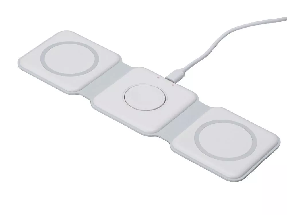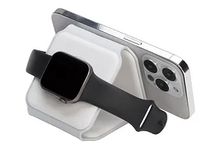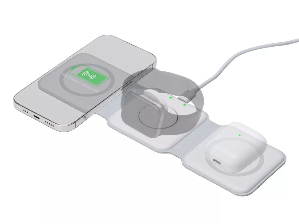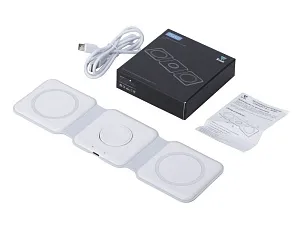 Беспроводная зарядная станция 3 в 1 — это современное решение для быстрой и удобной зарядки ваших устройств. Эта компактная и практичная модель позволяет заряжать сразу три устройства одновременно- любой смартфона и наушники с поддержкой беспроводной зарядки по протоколу Qi, и часы Apple. - Мощность до 15 Вт: При подключении к сетевому адаптеру 18 Вт - Складная конструкция: Удобная складная форма делает станцию портативной и легко транспортабельной. Вы можете взять ее с собой в поездки или хранить в небольшом пространстве без проблем - Поддержка MagSafe: Совместимость с технологией MagSafe обеспечивает надежное магнитное прикрепление и оптимальную передачу энергии для устройств Apple, таких как iPhone, AirPods и Apple Watch - Элегантный дизайн: Простой и минималистичный внешний вид станции гармонично впишется в любой интерьер или рабочее пространство.