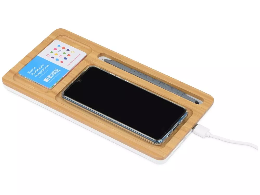 Органайзер Timber с функцией беспроводной зарядки — современный и стильный бизнес-подарок для поклонников экодизайна. Подойдет для хранения смартфона, ручки и визитных или клубных карт. Лаконичный дизайн с выраженной текстурой бамбука позволяет аксессуару гармонично вписаться практически в любой интерьер. В комплект входит кабель USB-C. Дополнительный плюс — выходной разъем USB.