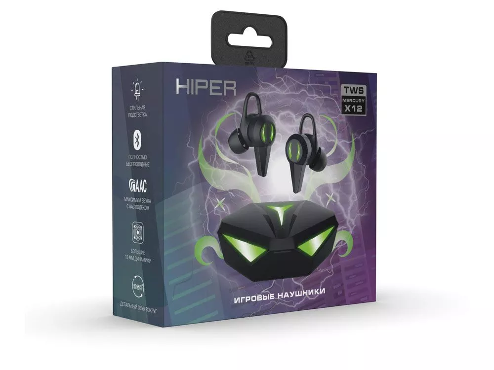 HIPER TWS Mercury X12 – это беспроводные наушники для тех, кто предпочитает неповторимый стиль и футуристичный дизайн. Вы оцените невероятное удобство в сенсорном управлении музыкой, а также в переключении режимов игры, музыки или звонка. • Низкая задержка передачи звука - 50-60 мс. • Подключаются по Bluetooth 5.1. • Чёткость звука обеспечивают динамики 13 мм чувствительностью 112 дБ. • Ёмкость аккумуляторов в каждом наушнике 35 мАч. • Время активной работы 4.5 часа, работа в режиме ожидания 140 часов, время зарядки 1.5 часа. • Чехол-зарядка оснащён портом type – C и индикатором, отображающим уровень заряда кейса и каждого наушника. • Ёмкость аккумулятора кейса 350 мАч, время работы от аккумулятора в кейсе 6 часов. • Есть функция поддержки голосовых ассистентов Google, Siri.