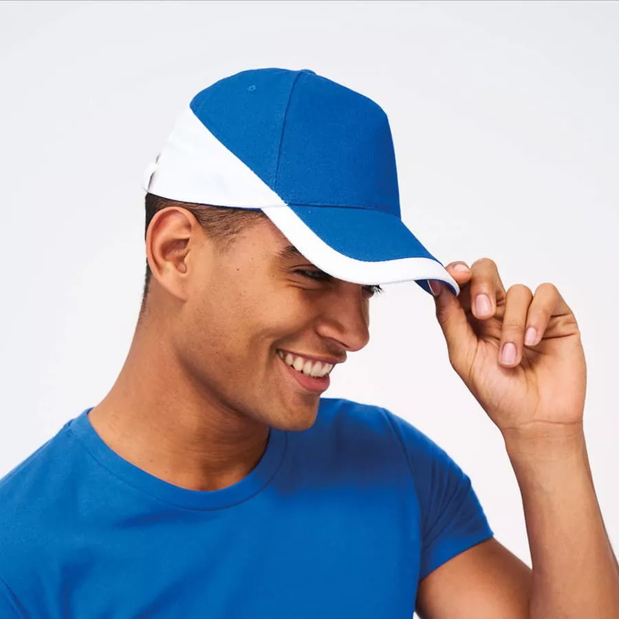 Двухцветная бейсболка из 100% плотного хлопка с начесом, жесткий козырек "сэндвич", 4 вышитых отверстия для вентиляции, регулируемая металлическая застежка