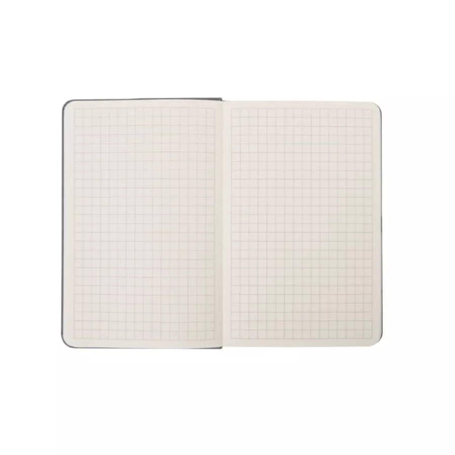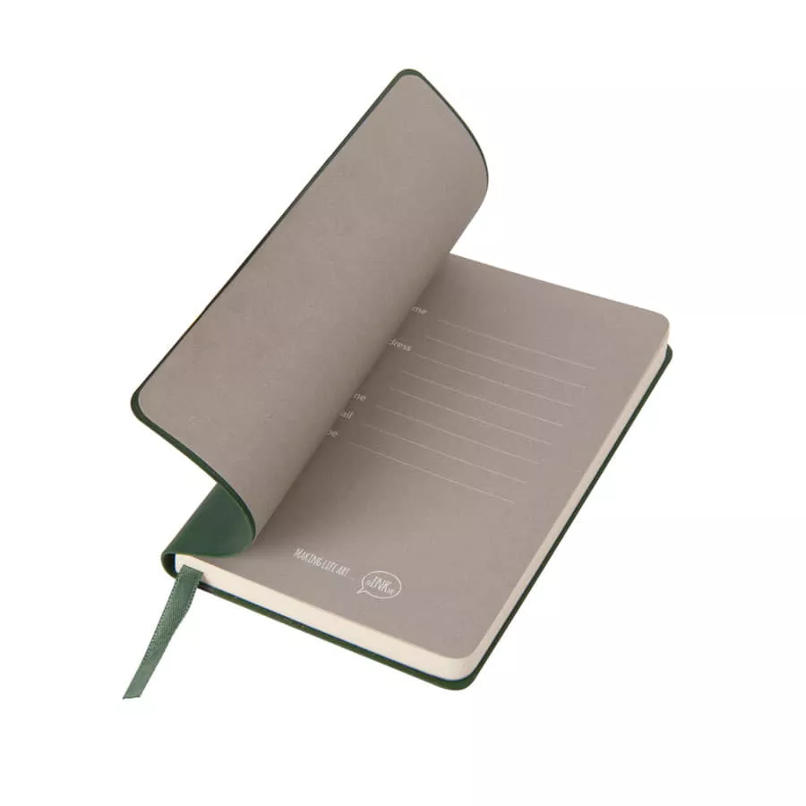 Размер 90х140 мм Материал обложки Velvet, гибкая обложка Цвет обложки близкий к Pantone 3435C Бумага кремовая Форзац Нахзац серый цвет, близкий к Pantone Cool Gray 5U Количество страниц 192 Перфорация 8 листов Блок в клетку