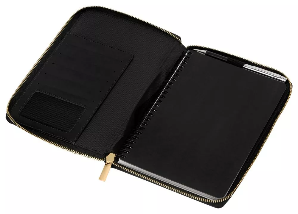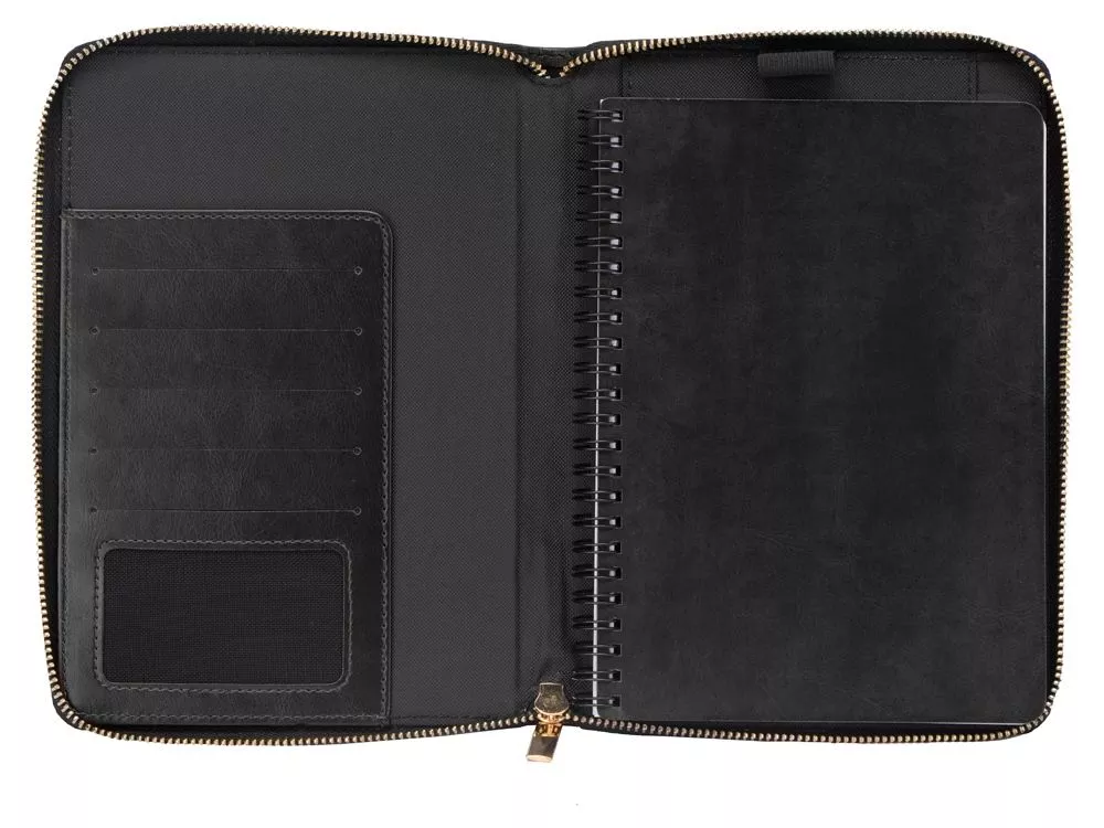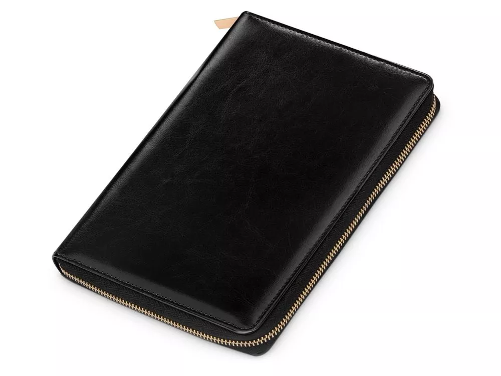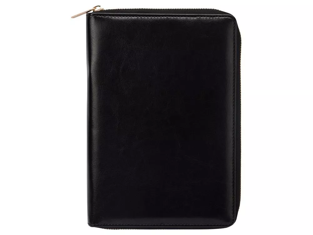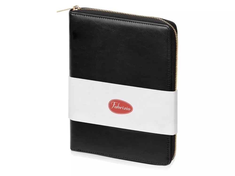 Бизнес блокнот Fabrizio состоит из пенала на молнии выполненного из искусственной кожи, и сменной тетради на 80 листов на кольцах с перфорированными линованными листами белого цвета.