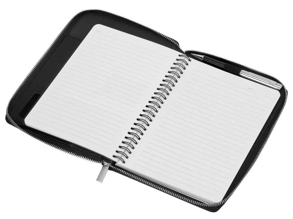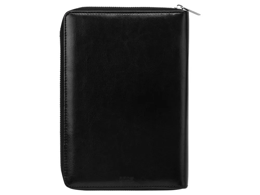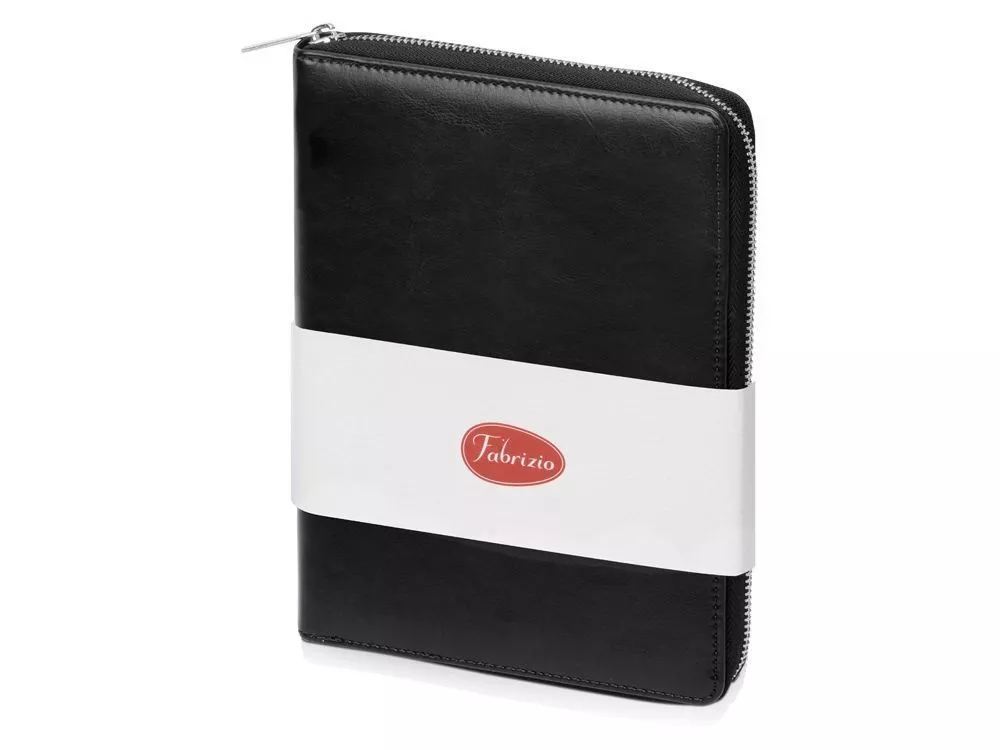Бизнес блокнот Fabrizio состоит из пенала на молнии выполненного из искусственной кожи, и сменной тетради на 80 листов на кольцах с перфорированными линованными листами белого цвета. Блокнот снабжен 5 отделениями для карт и RFID защитой, которая охраняет вашу личную и финансовую информацию от мошенников. Внутри блокнота есть петля для ручки в тон (ручка в комплект не входит). Тиснение (Блинт) на данный товар осуществляется бесплатно. Оплачивается только настройка оборудования в размере 6200 рублей на весь тираж.