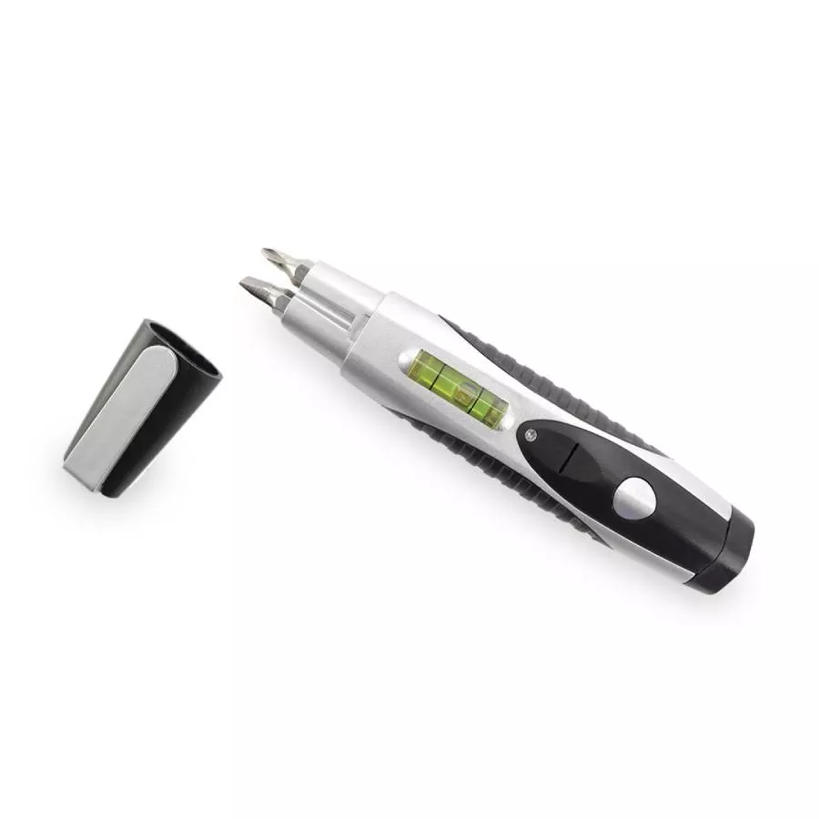 Мультитул с устойчивым нескользящим корпусом и 4 аксессуарами. nbsp;Включает в себя 2 головки отверток с плоской и крестообразной головкой, nbsp;строенный в корпус уровень и светодиодный фонарик. nbsp;Поставляется в белой индивидуальной коробке. nbsp;Батарейки входят в комплект поставки. Размер изделия: 14 x 2 x 2.6 смВес: 46 гр.