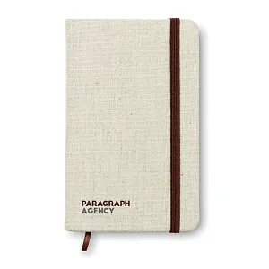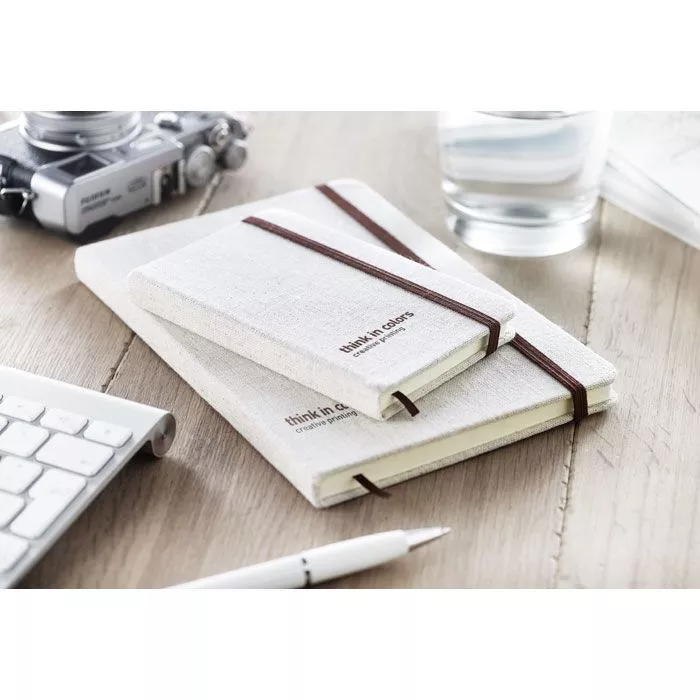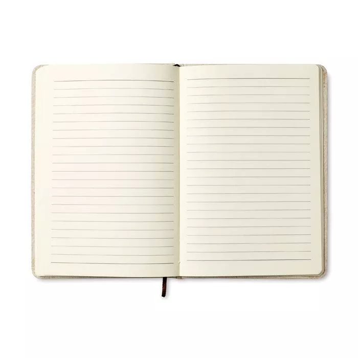 A6 notebook with hard canvas cover. Casebound. 192 lined pages (96 sheets). Contrasting elastic closure strap and ribbon page-marker.
