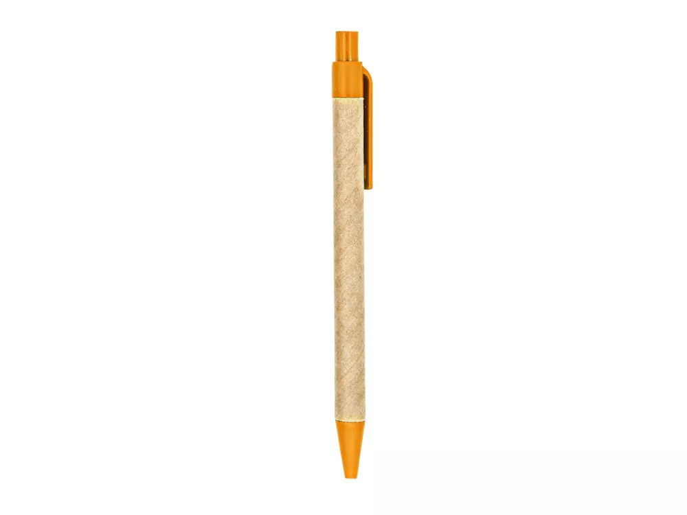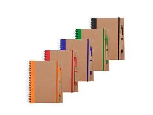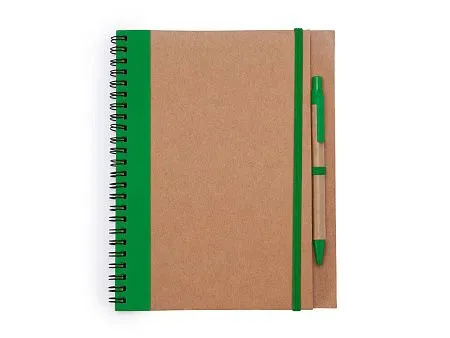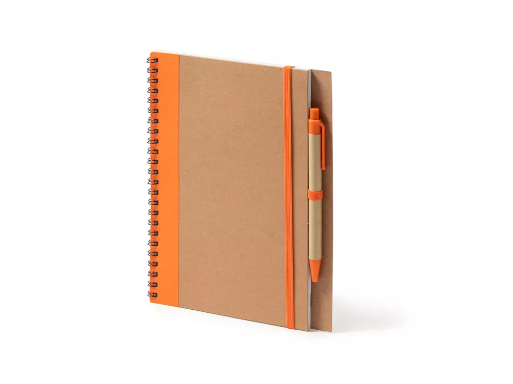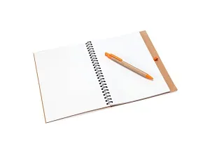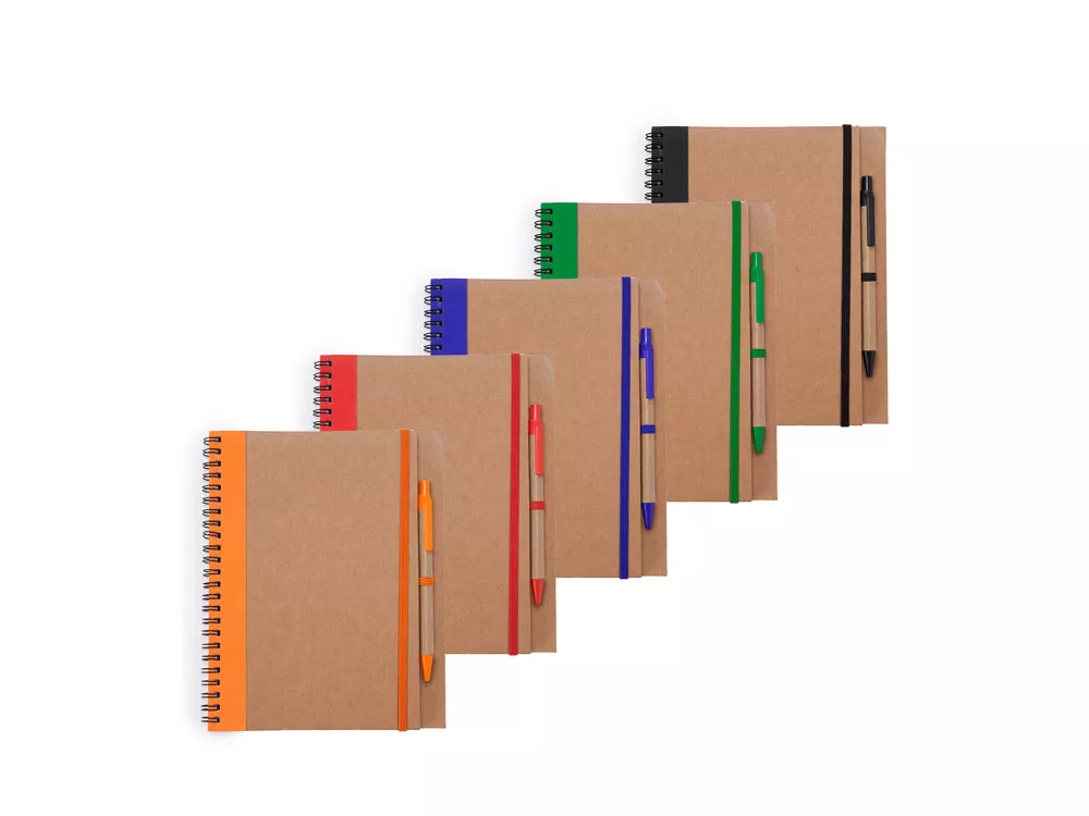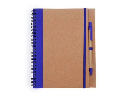 Блокнот на спирали с жесткой обложкой из переработанного картона. Включает шариковую ручку с синими чернилами. 60 простых листов.