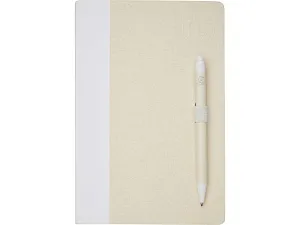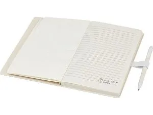 Блокнот размером A5 и набор шариковых ручек. Блокнот имеет 80 линованных листов (80 г/м²) из переработанных коробок из-под молока (до 70%), цветную спираль для бумаги и петлю для ручки. В петле находится шариковая ручка с кнопочным механизмом, цвет которой соответствует цвету блокнота. Корпус ручки также изготовлен из переработанных коробок из-под молока, а кнопка, зажим и наконечник изготовлены из цветного PLA-пластика. Внутри ручки имеется черный стержень. Картонные коробки из-под молока собираются, сортируются, перерабатываются и превращаются в бумагу, таким образом действительно превращая мусор во что-то полезное.