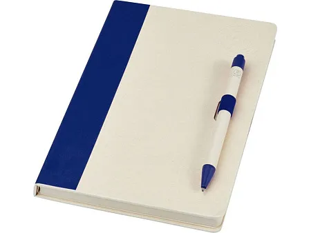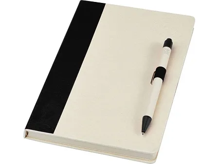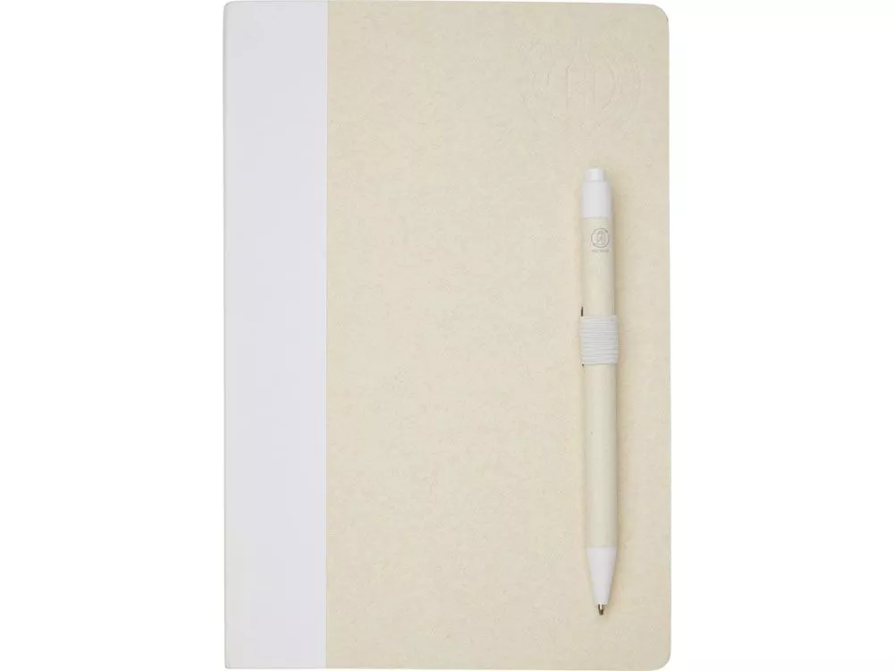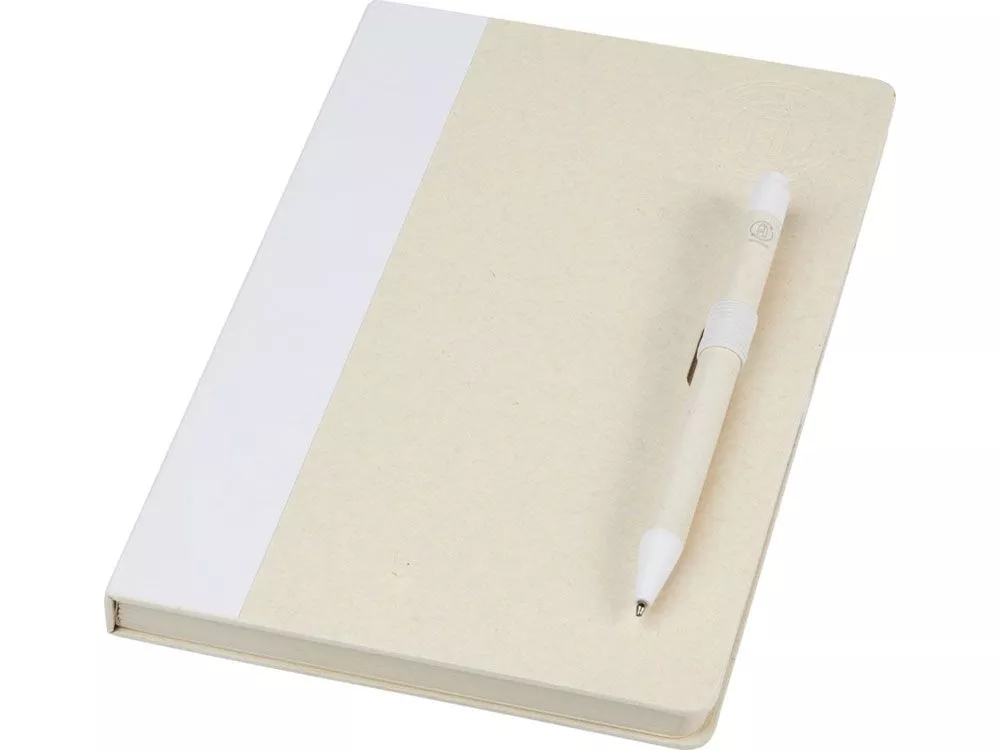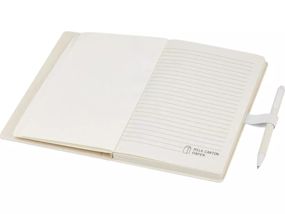 Блокнот размером A5 и набор шариковых ручек. Блокнот имеет 80 линованных листов (80 г/м²) из переработанных коробок из-под молока (до 70%), цветную спираль для бумаги и петлю для ручки. В петле находится шариковая ручка с кнопочным механизмом, цвет которой соответствует цвету блокнота. Корпус ручки также изготовлен из переработанных коробок из-под молока, а кнопка, зажим и наконечник изготовлены из цветного PLA-пластика. Внутри ручки имеется черный стержень. Картонные коробки из-под молока собираются, сортируются, перерабатываются и превращаются в бумагу, таким образом действительно превращая мусор во что-то полезное.