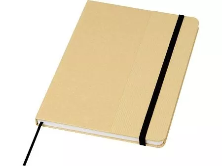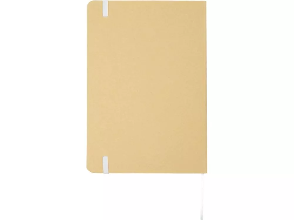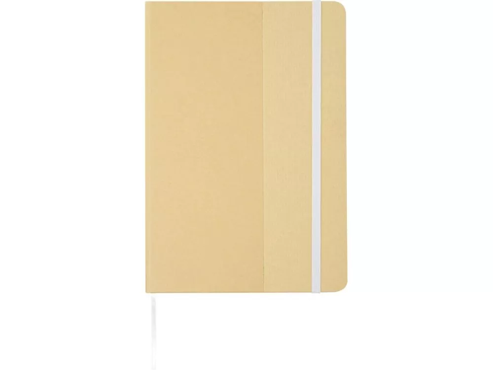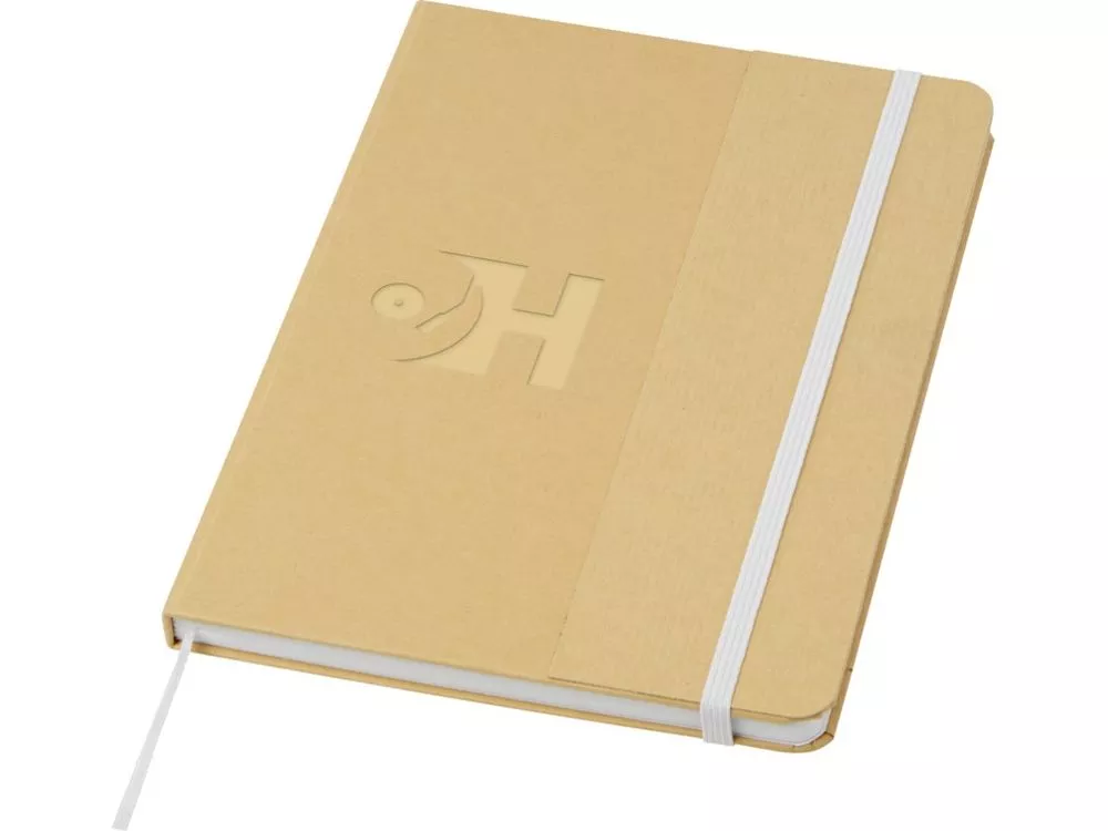 Блокнот формата А5 в твердой обложке из переработанного картона, 80 листов бумаги плотностью 70 г/м² в линейку. Блокнот имеет эластичную застежку, ленту и закругленные углы. FSC certified paper. FSC Mix 100% P7.1 CU-COC-877277.