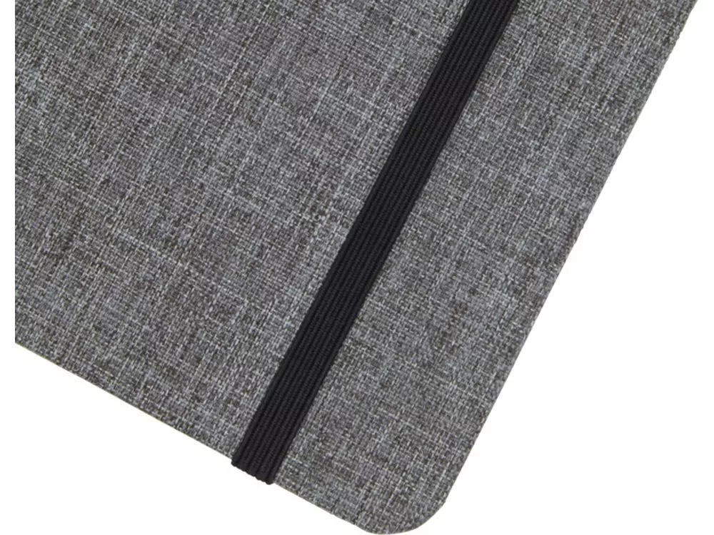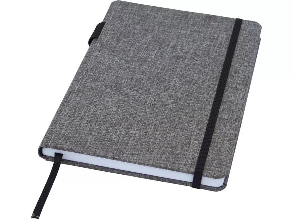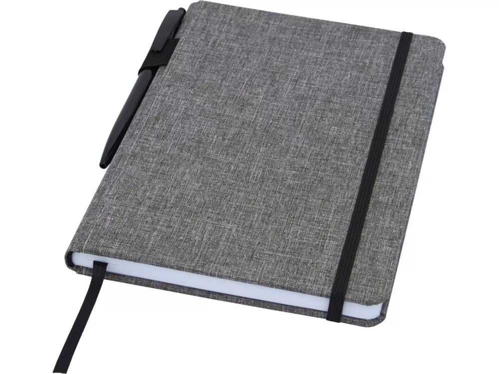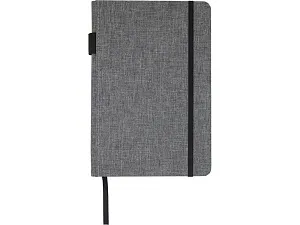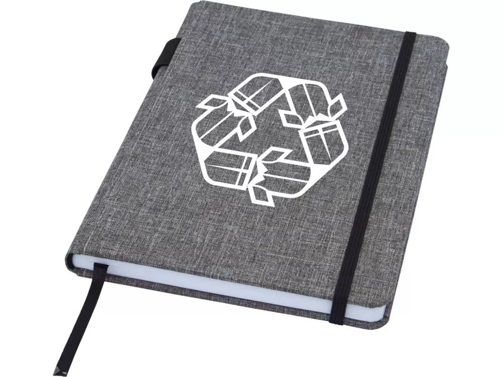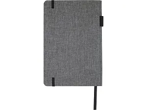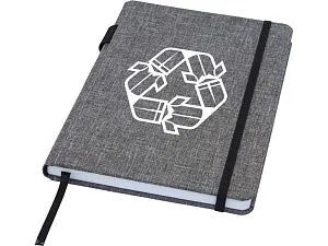 Блокнот формата А5 с отделкой из переработанного ПЭТ. Содержит 96 листов в линию плотностью 70 г/м², изготовленных из переработанной бумаги, с петлей для ручки и лентой-закладкой. В упаковке из картона.
