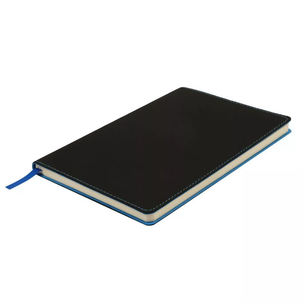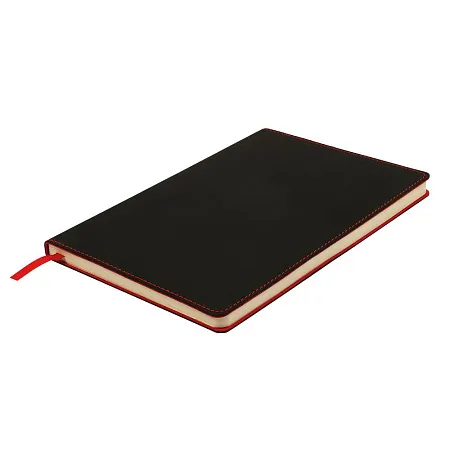 Блонот формата А5 в мягкой обложке из искусственной кожи. Материал обложки - термополиуретан. Основной цвет - чёрный; строчка по периметру, внутенний край и ляссе - красного цвета. Размеры: 214*144мм, 80 листов, разлинееные страницы, бумага плотностью 80г/м2.