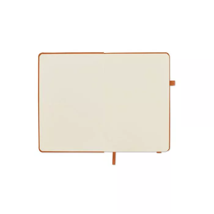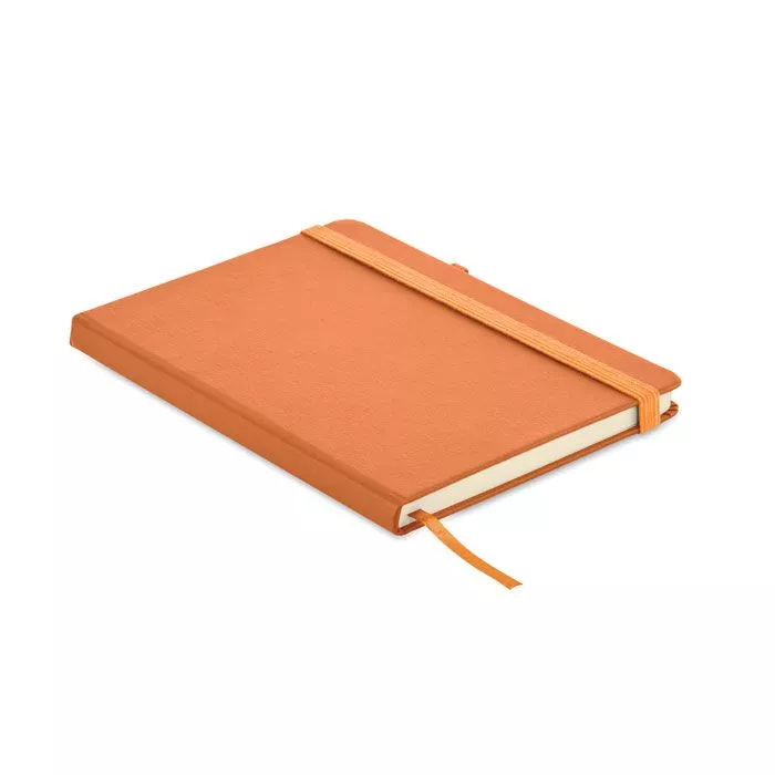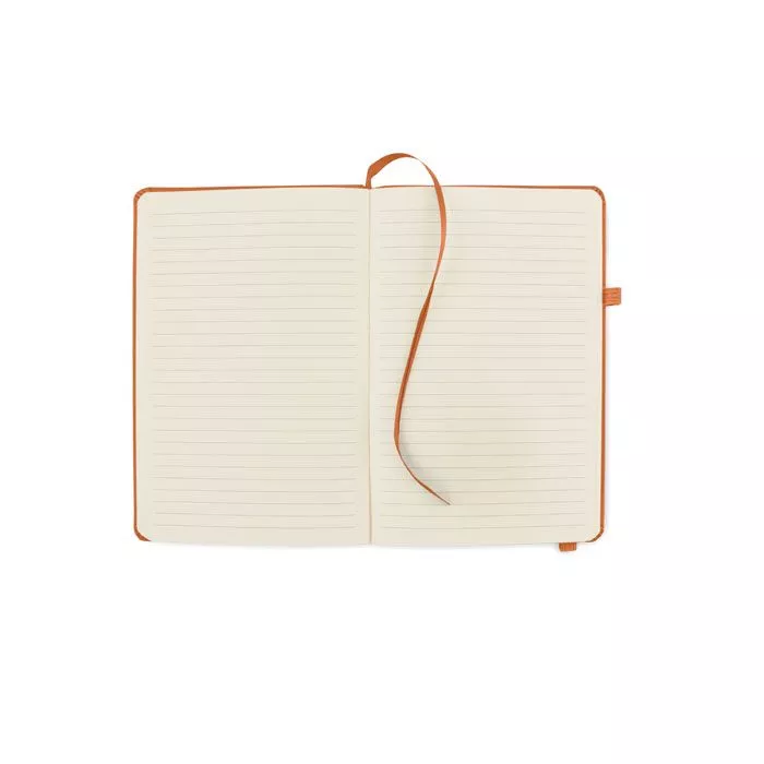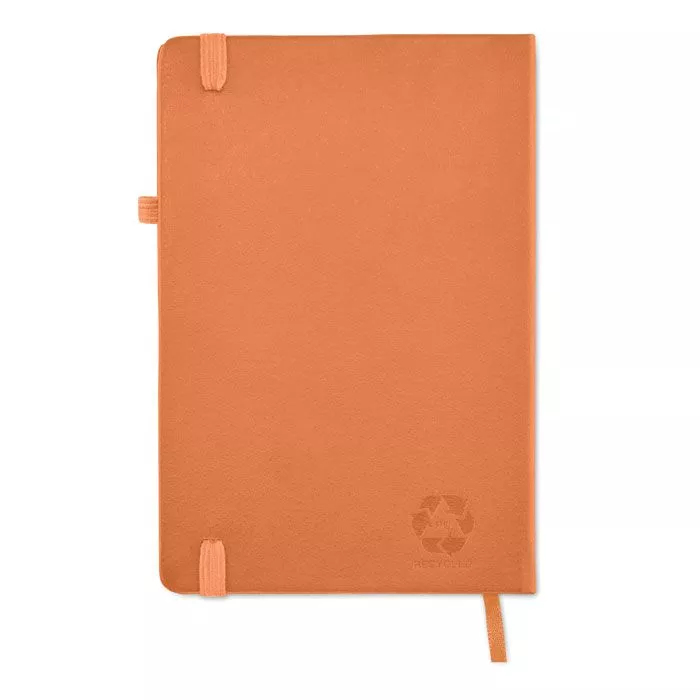 Блокнот формата A5 с обложкой из переработанного полиуретана. Переплетен в футляр. 192 линованные страницы из переработанной бумаги (96 листов). Соответствующий эластичный ремешок и ленточный держатель для маркеров и ленточных ручек.