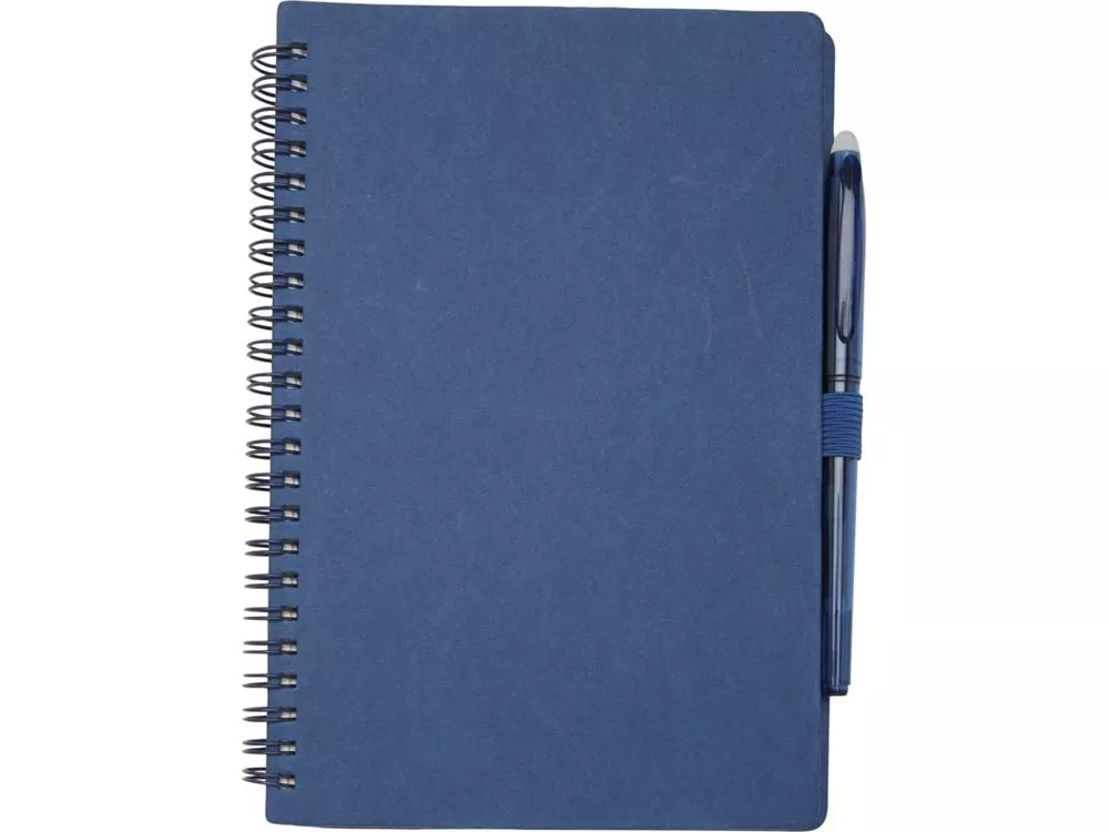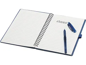 Многоразовый набор из ручки и блокнота в мягкой обложке из каменной бумаги. Блокнот имеет обложку из картона, закругленные углы и 32 листа линованной бумаги плотностью 120 г/м². В производстве каменной бумаги не используется дерево, а на сам процесс изготовления затрачивается гораздо меньше энергии в сравнении с производством переработанной или целлюлозной бумаги. Сзади имеется карман для хранения черной протирочной ткани (входит в комплект). Ручка из переработанного пластика с стираемыми чернилами, прозрачным корпусом, белым ластиком сверху и однотонной цветной рукояткой. Цвет чернил: черный. Длина непрерывной линии: 250 метров. Размер пера: 0,7 мм.