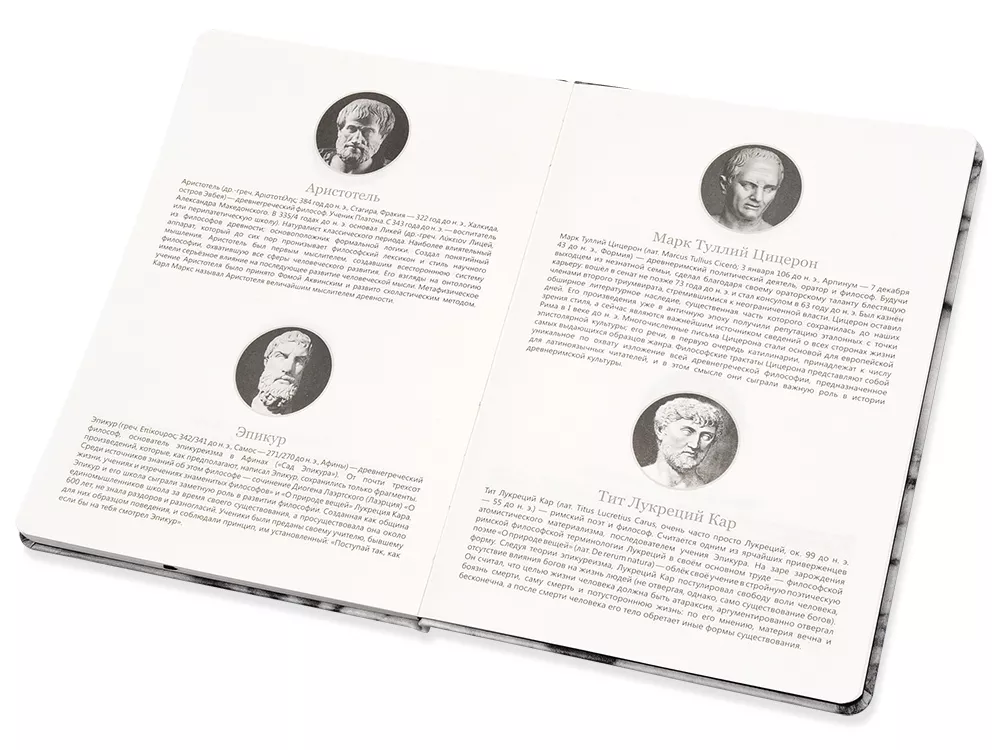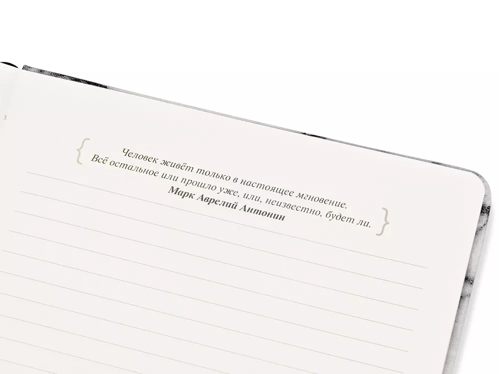 Блокнот А5 Socrates наполнен умными мыслями и цитатами великих философов. На каждой странице вы найдете ценные высказывания Диогена, Сенеки, Марка Аврелия и других гениев. В конце блокнота имеется краткая историческая справка про каждого философа с основными вехами его творчества. В блокноте 208 страниц красивой линованной бумаги и стильная закладка. Также дизайнеры придумали оригинальное решение и дополнили блокнот внутренним карманом для хранения записей или визиток. Твёрдая обложка, имитирующая белый мрамор, сделана из полиуретана, что делает ее очень приятной на ощупь. Этот блокнот поможет вам почувствовать себя настоящим современным Сократом. На его страницы так и хочется записать свои гениальные мысли и амбициозные планы. Будьте уверены, что он станет настоящим высокоэффективным инструментом в достижении целей и улучшения вашего качества жизни! Блокноты Lettertone - это отменное качество и минималистический дизайн. Главной особенностью этих товаров является проработка деталей и подбор материалов. Блокнот - полезный и необходимый подарок для любого сотрудника офиса. Он всегда позволит вовремя сделать необходимые заметки, составить планы или описать проект. На обложку блокнота можно нанести изображение или логотип. Блокноты Lettertone - отличное решение для продвижения вашего бизнеса!