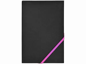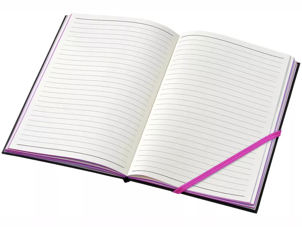 Блокнот, ориентировочный формат A5 с 80 листами бежевой бумаги (70 г/м²) с диагональной эластичной застежкой и яркими неоновыми краями.