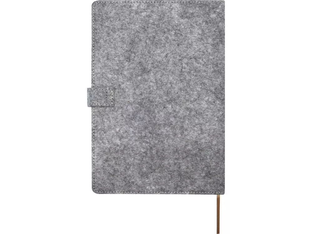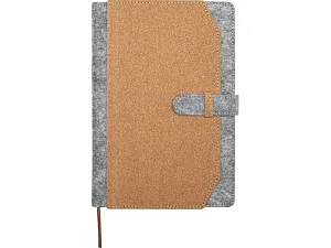 Блокнот формата А5 в твердой обложке из переработанного фетра и пробки, 80 листов бумаги плотностью 70 г/м² в линейку. Блокнот имеет 3 кармана для визиток, коричневую ленту в тон и закругленные углы. FSC certified paper, RPET felt, FSC certified cork. FSC Mix 100% P7.1 CU-COC-877277.