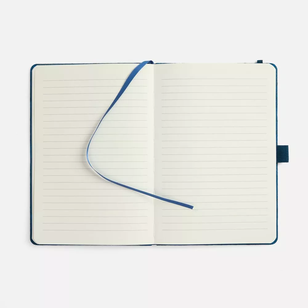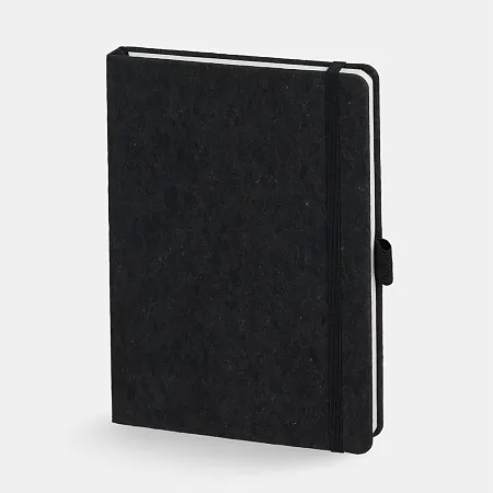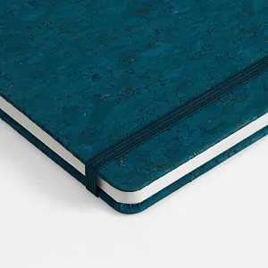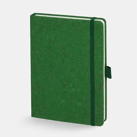 Блокнот с твердой обложкой из из натуральной окрашенной пробки, дополнен петлей-резинкой для ручки, ляссе и резинкой в цвет обложки.