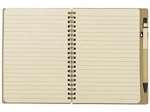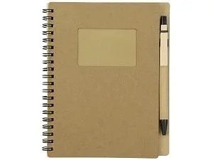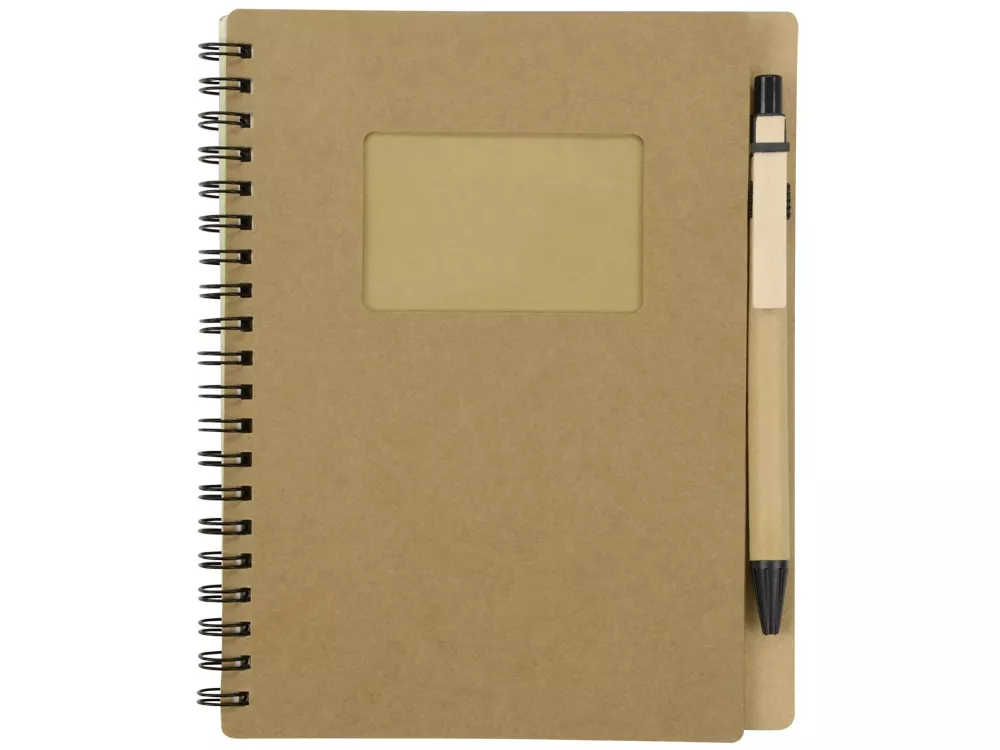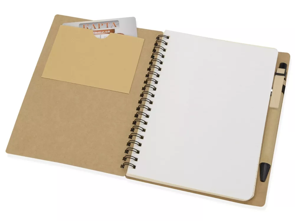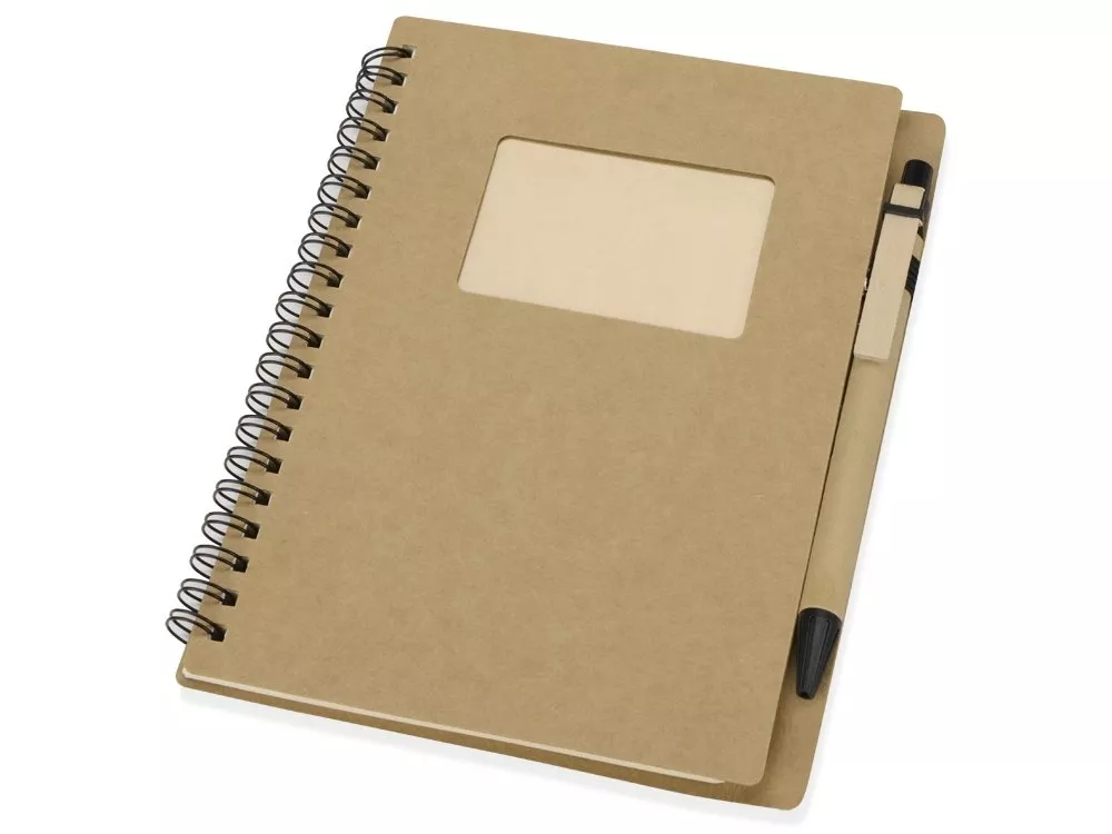 Блокнот Дейзи сделан из бумаги и картона и переплетен на пружине. В обложке блокнота предусмотрено окошко, в которое можно поместить визитную карточку или полиграфическую вставку. В комплекте с блокнотом идет ручка, которая вставляется в петельку сбоку. Блокнот с ручкой Дейзи – универсальный сувенир в эко-стиле.