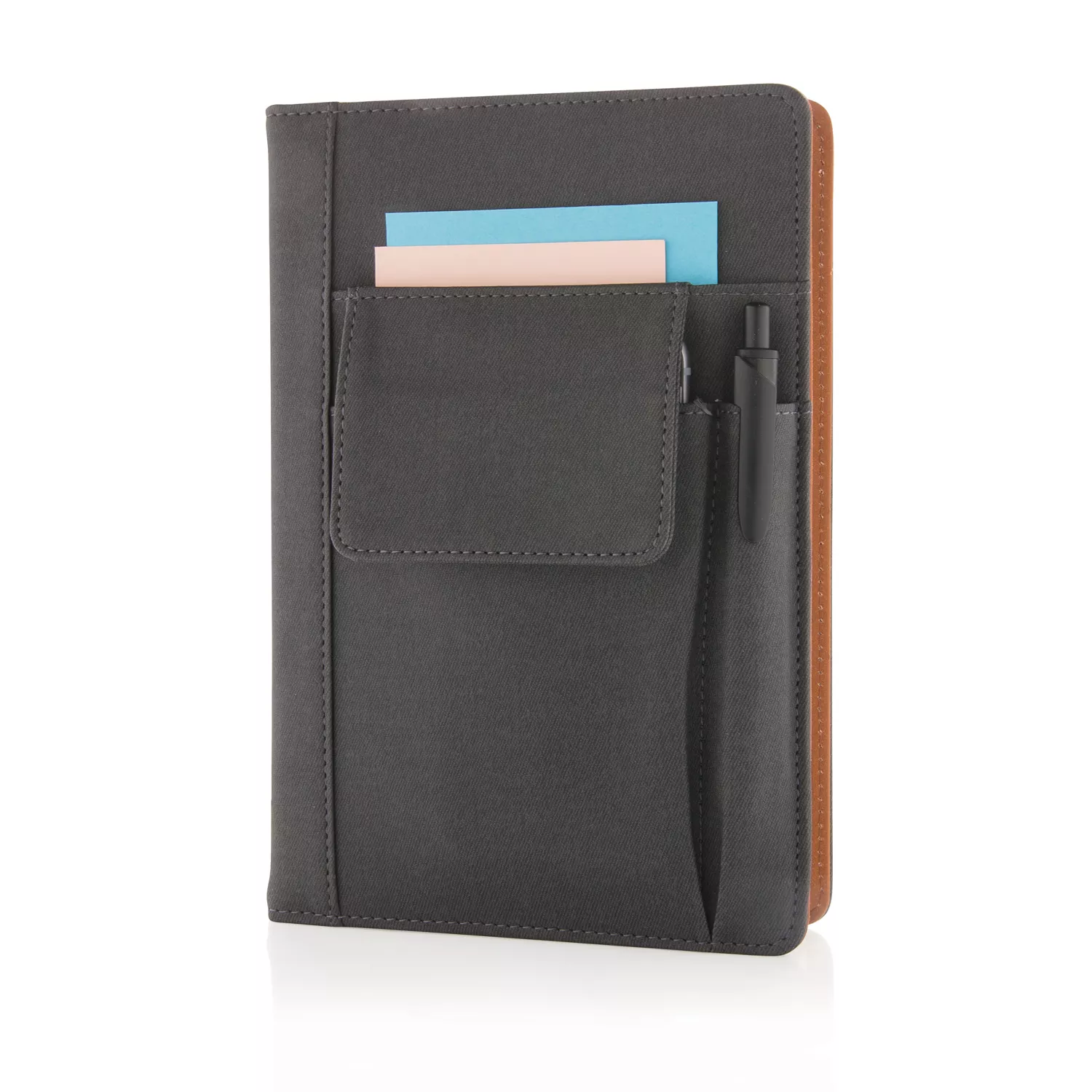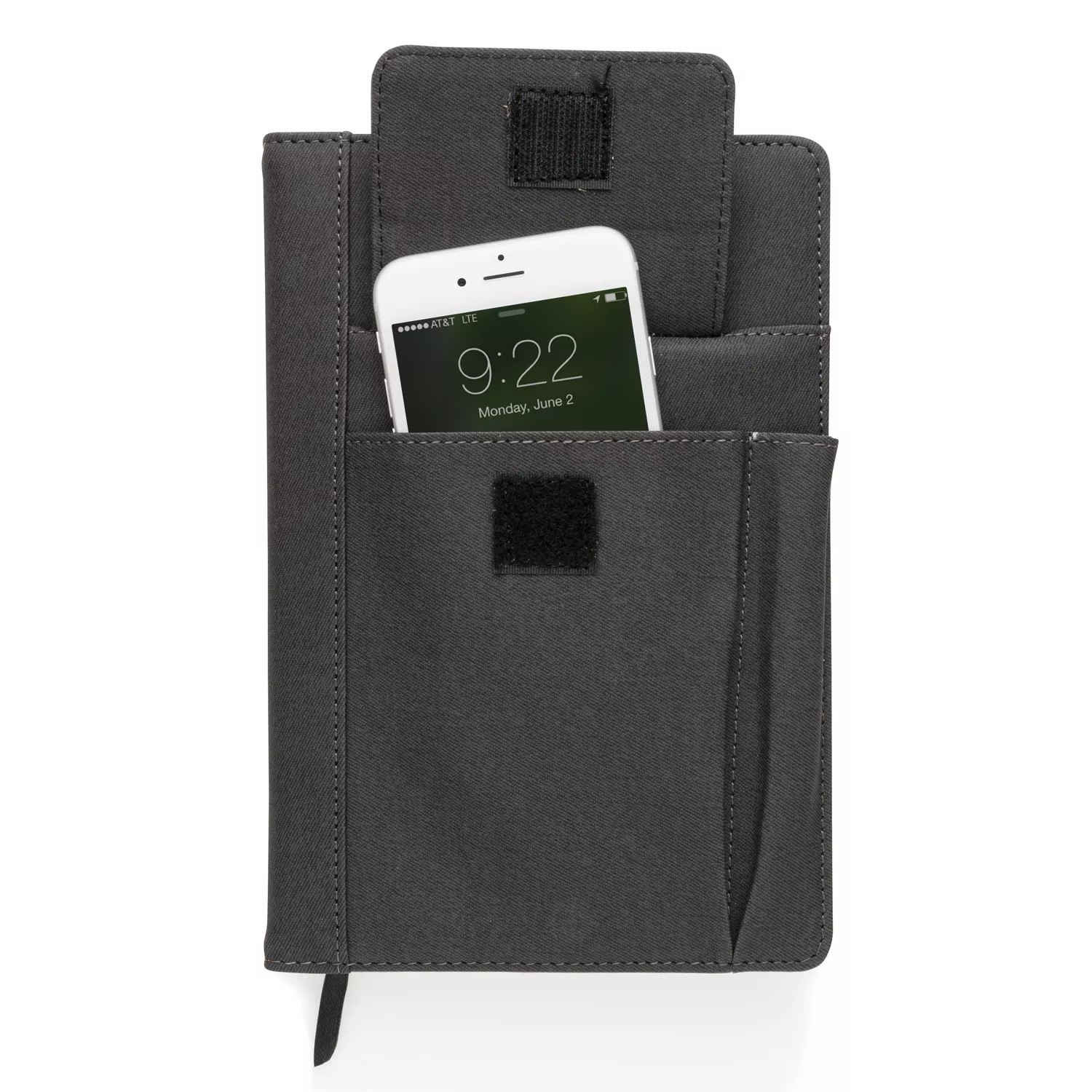 Тканевая обложка блокнота с передним отделением для телефона (14 х 10 см), с кармашком для пишущих принадлежностей и основным отделением для визиток или внешнего аккумулятора. Блокнот на 80 страниц, плотность бумаги 80 г/м2. После того как блокнот закончится, его легко поменять на новый.
