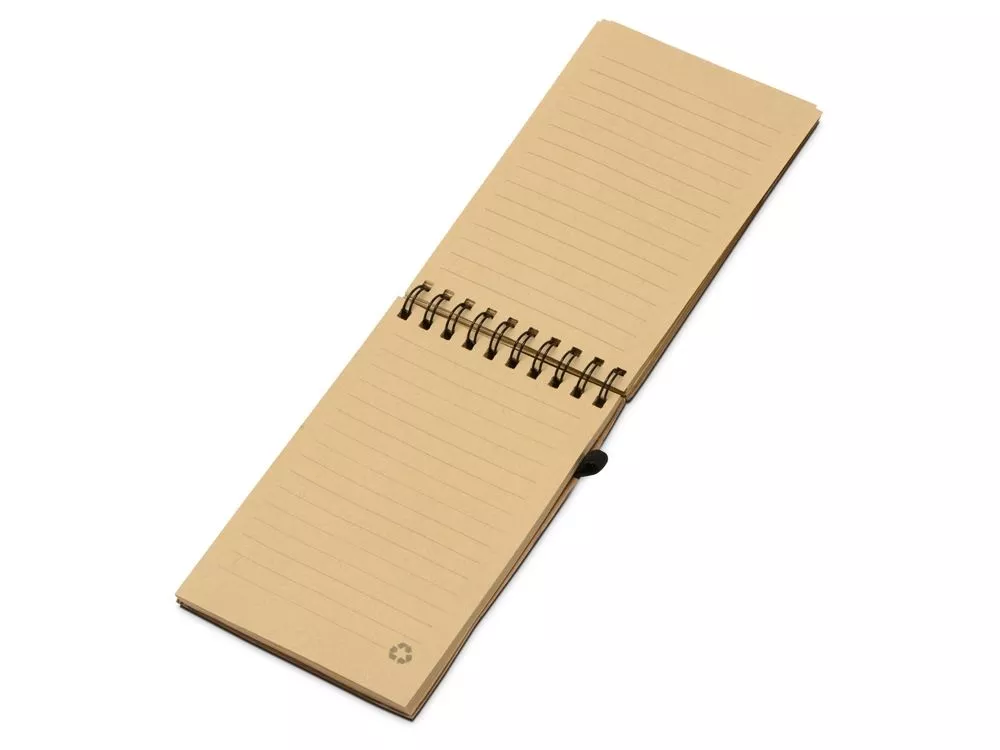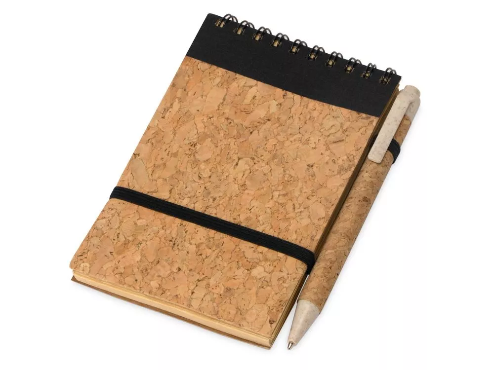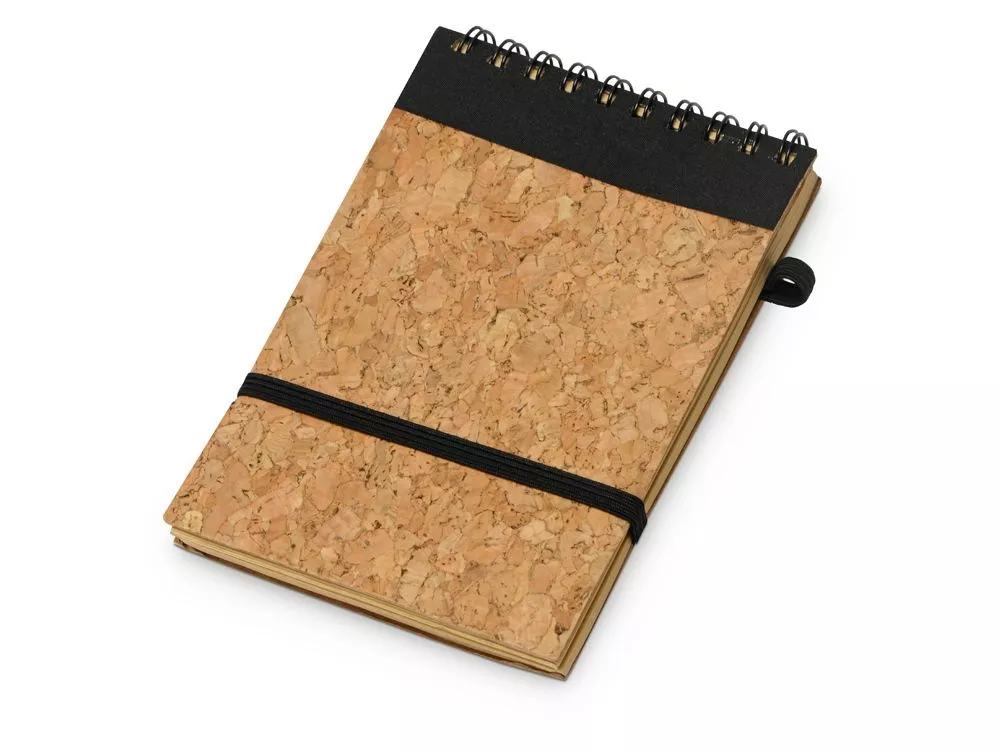 Оригинальный блокнот с обложкой из пробки и картона, а также блоком из переработанной бумаги. Петля для ручки и горизонтальная резинка расширяют функциональность.