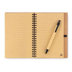 Блокнот с пробковой обложкой. Блок 70 листов линованной переработанной бумаги и шариковая ручка, в корпусе из переработанной бумаги и фурнитурой из кукурузного пластика. Черные чернила.