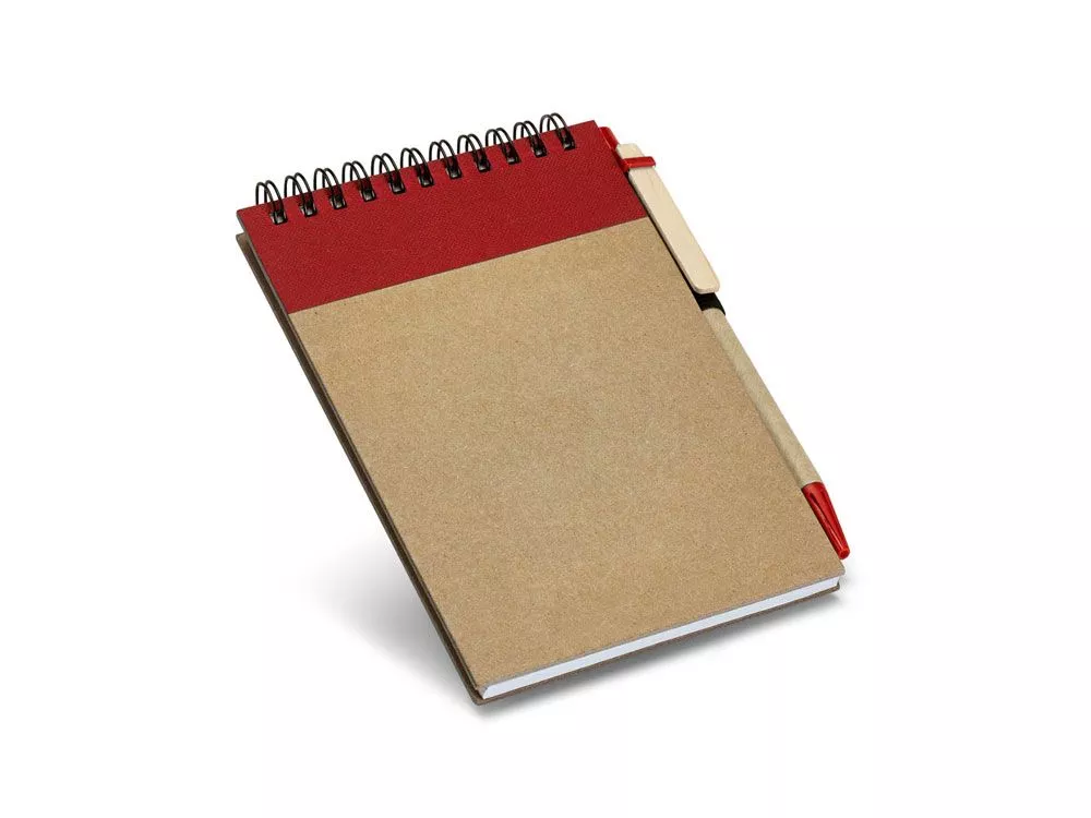Карманный блокнот на спирали, на 120 страниц из переработанной бумаги и обложкой из твердого картона. Блокнот имеет держатель для шариковой ручки (входит в комплект). 105 x 145 мм. Вид нанесения, рекомендуемый поставщиком: тампопечать, трафаретная печать, трансфер.