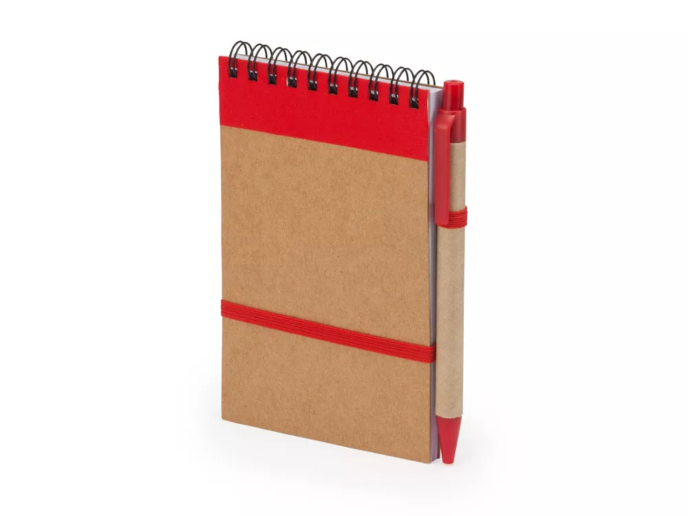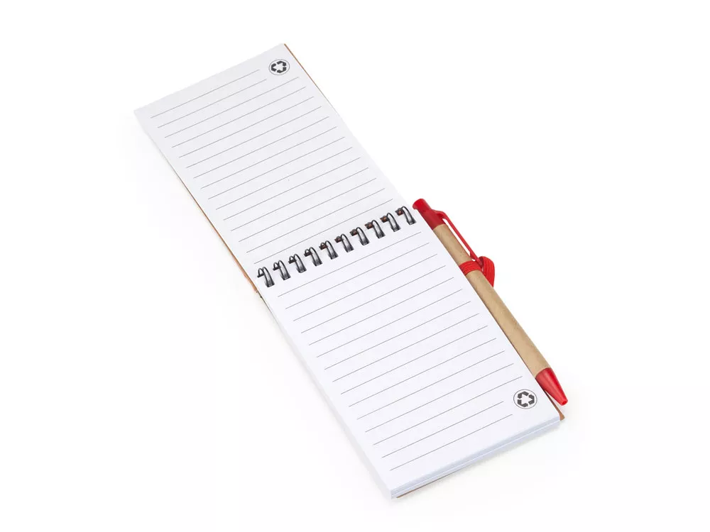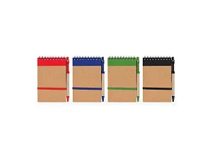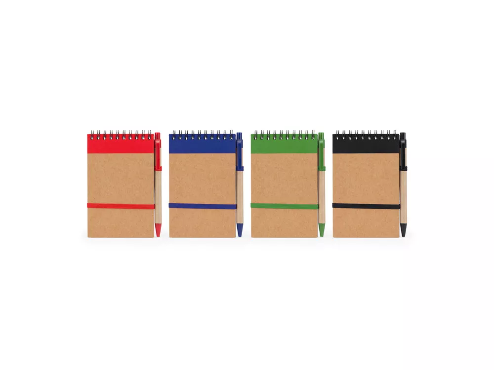 Блокнот на спирали с жесткой обложкой из переработанного картона. Включает шариковую ручку с синими чернилами. 70 листов.