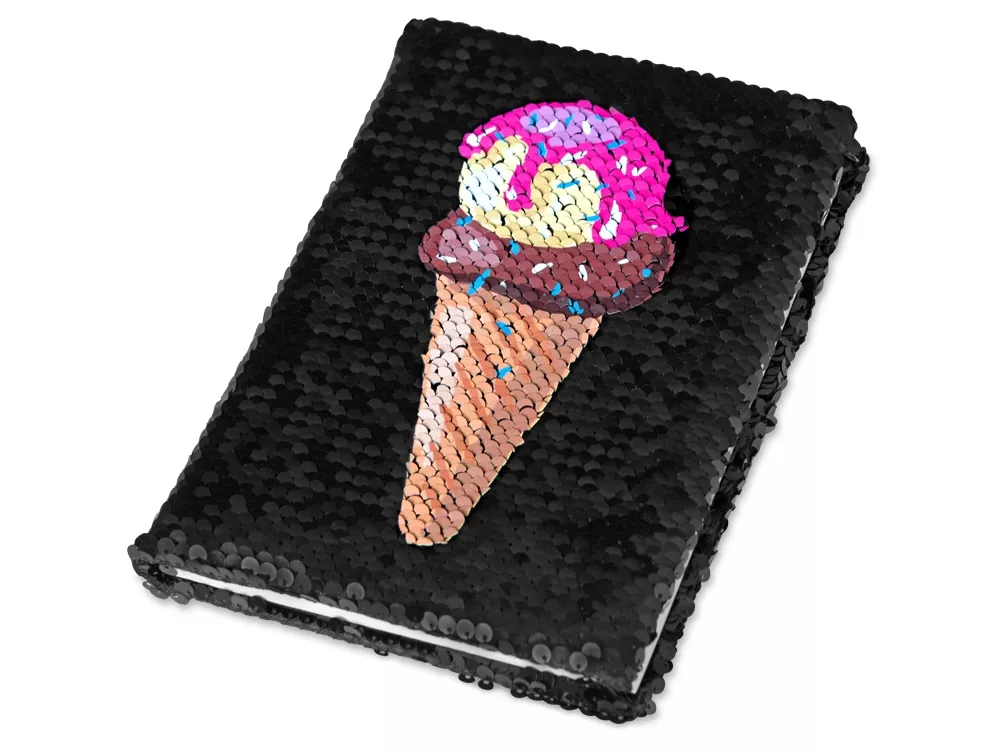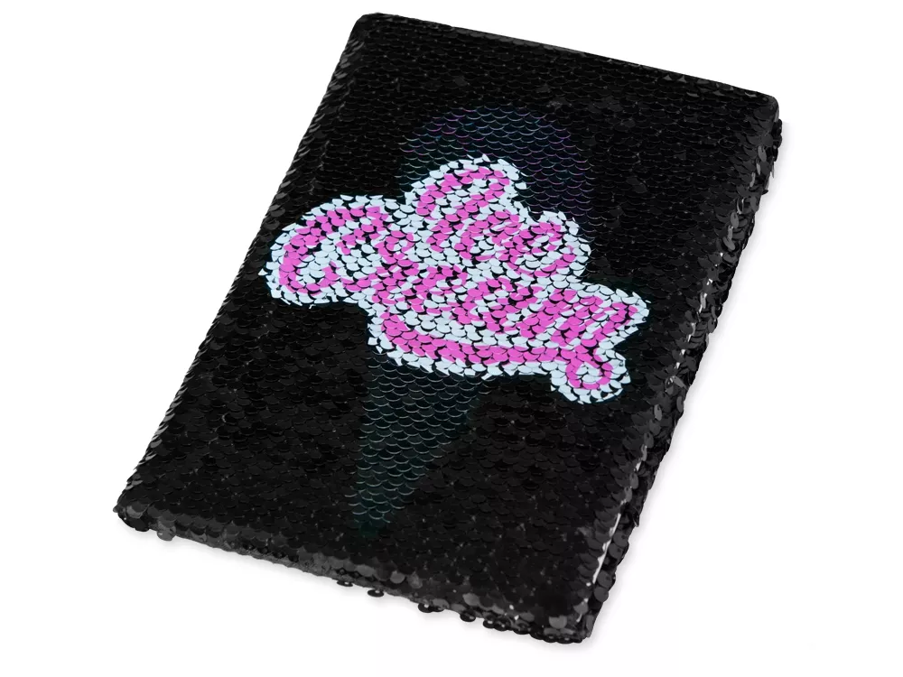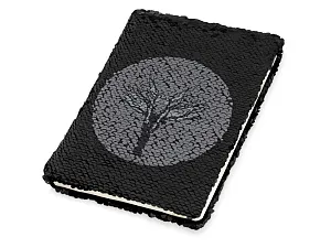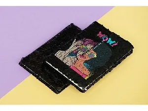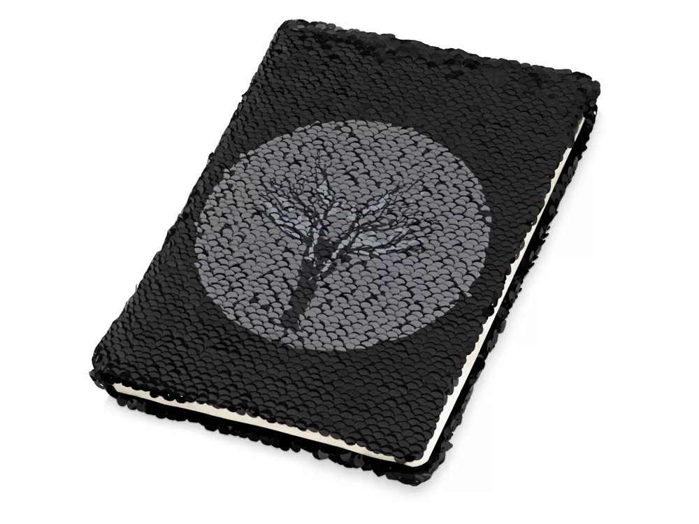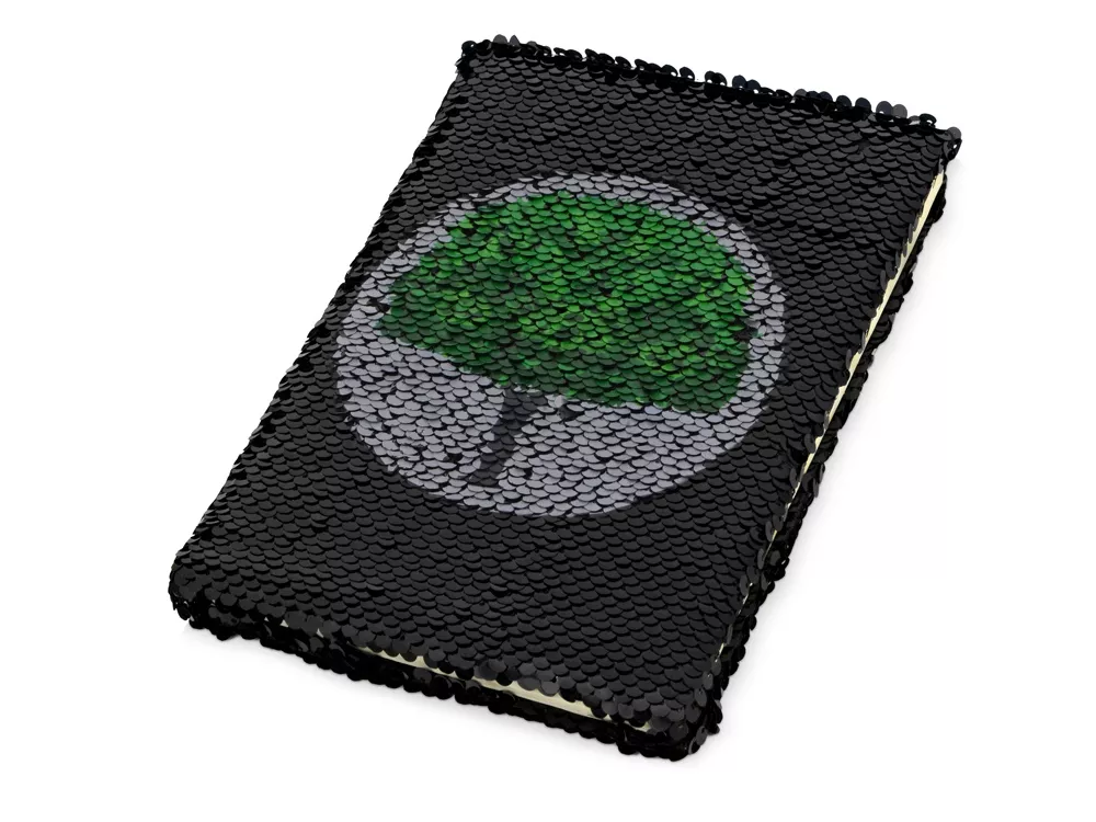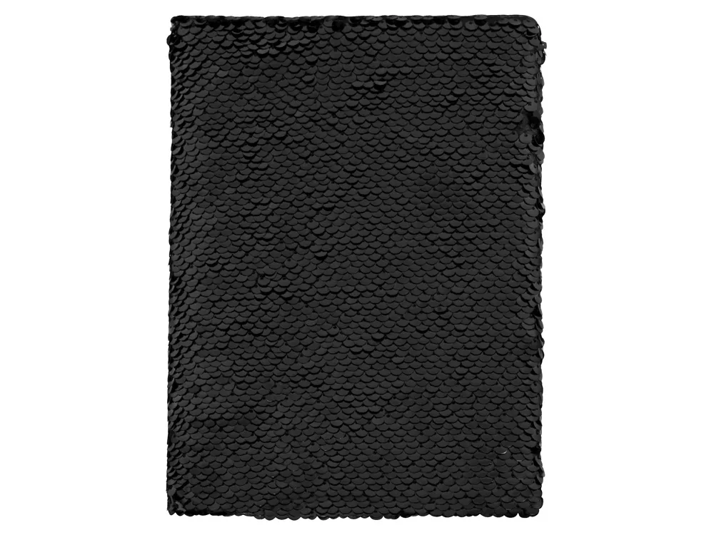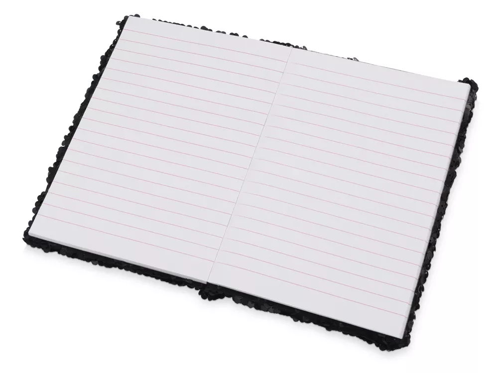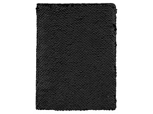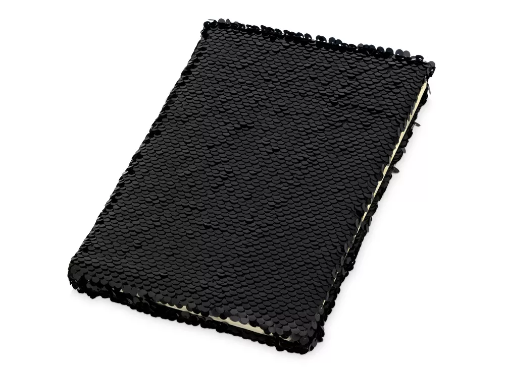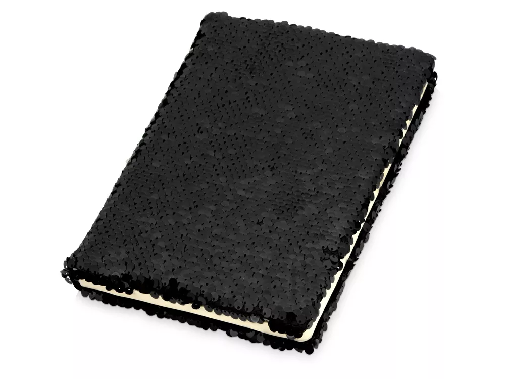 Блокнот Fashion с пайетками - это бизнес-подарок с оригинальным дизайнерским решением. Такой сувенир точно привлечет внимание коллег и клиентов! Особенности блокнота: Модная обложка с пайетками черного цвета имеет скругленные углы. В блокноте 160 линованных страниц кремового цвета с плотностью 70 г/м2. Нанесение возможно с обеих сторон пайеток.