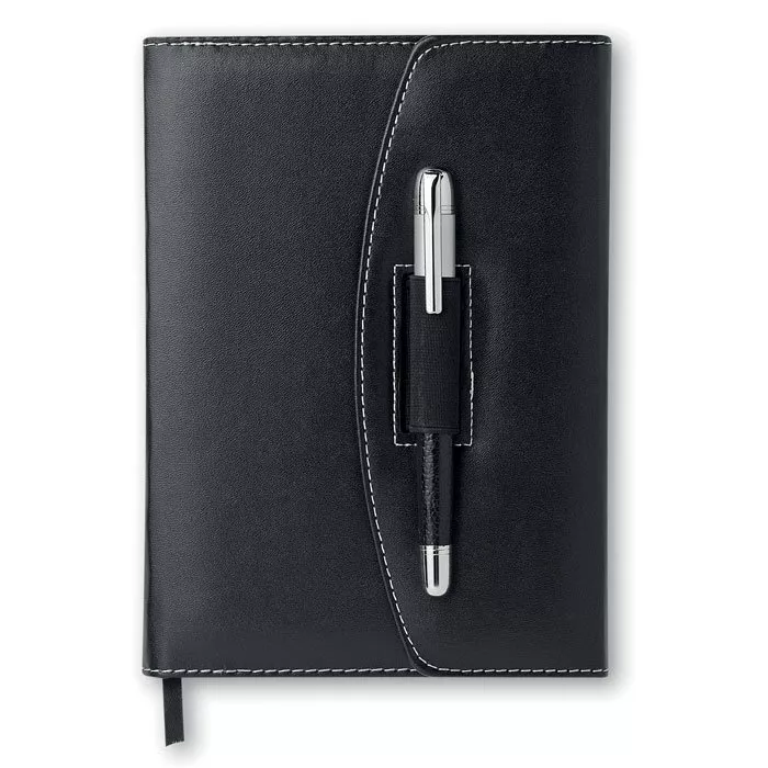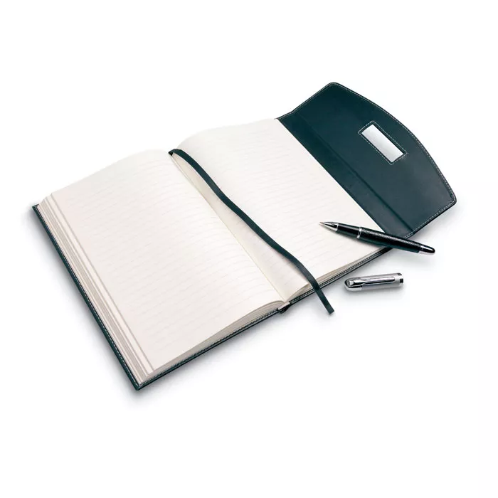 Блокнот формата А5 из искусственной кожи с контрастной строчкой. 120 листов линованной бумаги и металлическая ручка с черными чернилами.