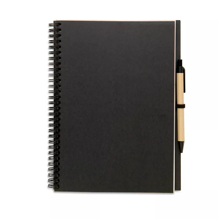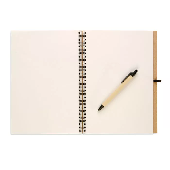 Блокнот с картонной обложкой. Включает 70 страниц вторично переработанной бумаги и синюю шариковую ручку из биопластика.