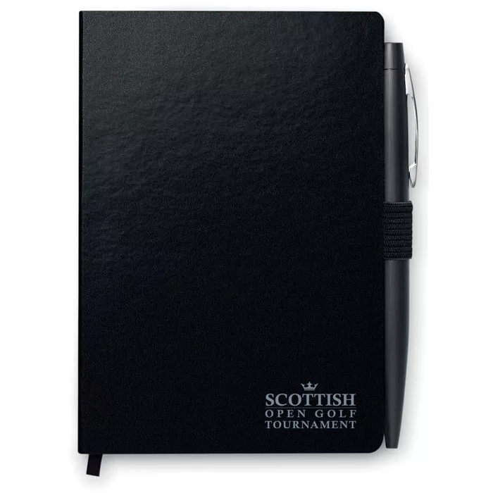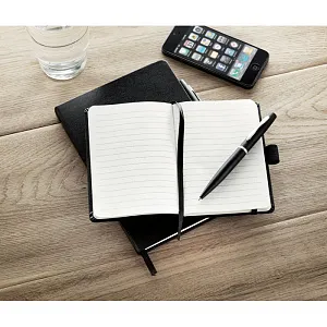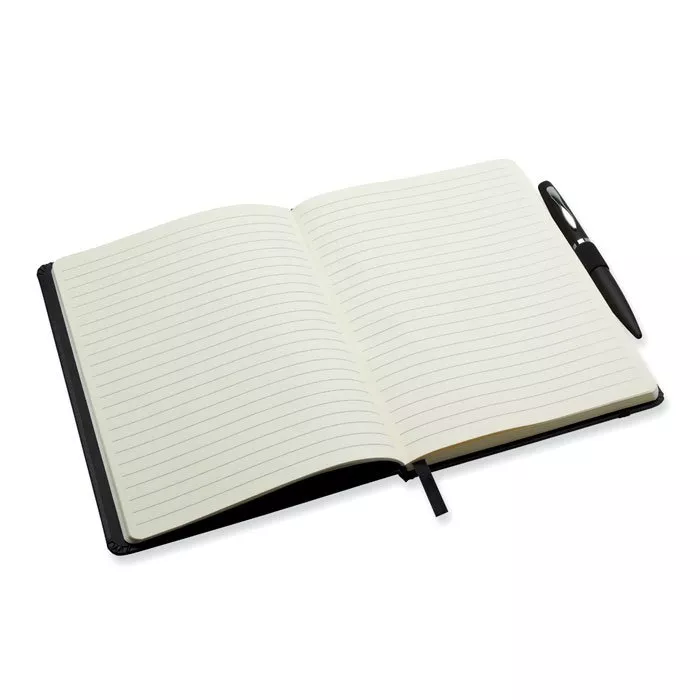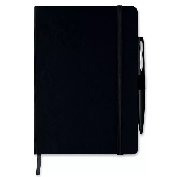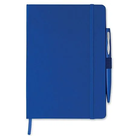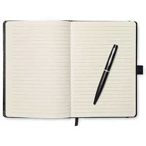 Блокнот A5 с обложкой из картона, 72 линованных листа, с лентой- закладкой, перетянут резинкой. Включает металлическую шариковую ручку с синими чернилами.